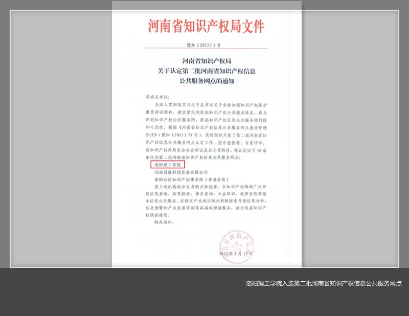 近日,河南省知识产权局公布了第二批河南省知识产权信息公共服务网点名单,洛阳腾博官网诚信为本专业服务知识产权信息服务中心成功入选。此次入选标志着学校知识产权信息服务能力迈上新的台阶。
