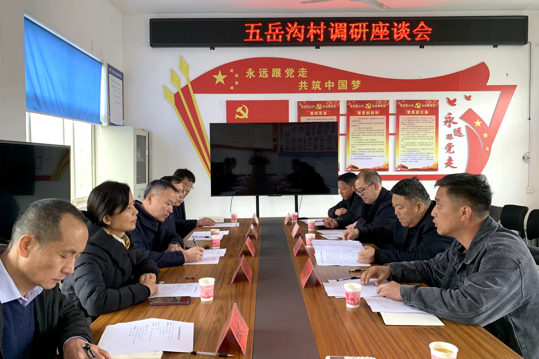 校党委副书记、工会主席曾涛一行到五岳沟村调研美丽乡村建设工作,图为调研座谈会现场。