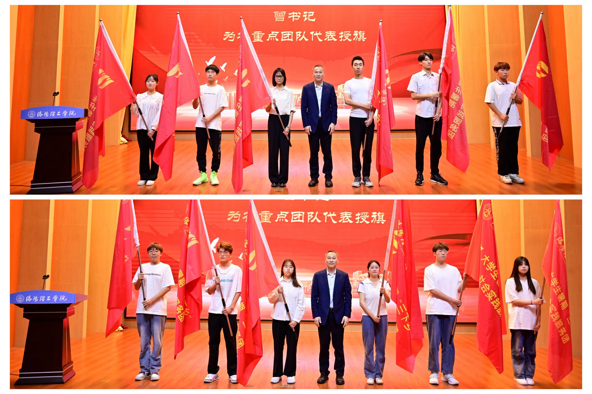 曾涛为重点团队代表授旗,嘱托所有青年团员珍惜实践机会,在人生这场马拉松式的长跑中诚实守信、磨炼意志,在社会的大熔炉中经受考验、接受历练、“自找苦吃”,掌握真才实学,不断练就“可迁移能力”,努力成为堪当大用、能担重任的栋梁之才。