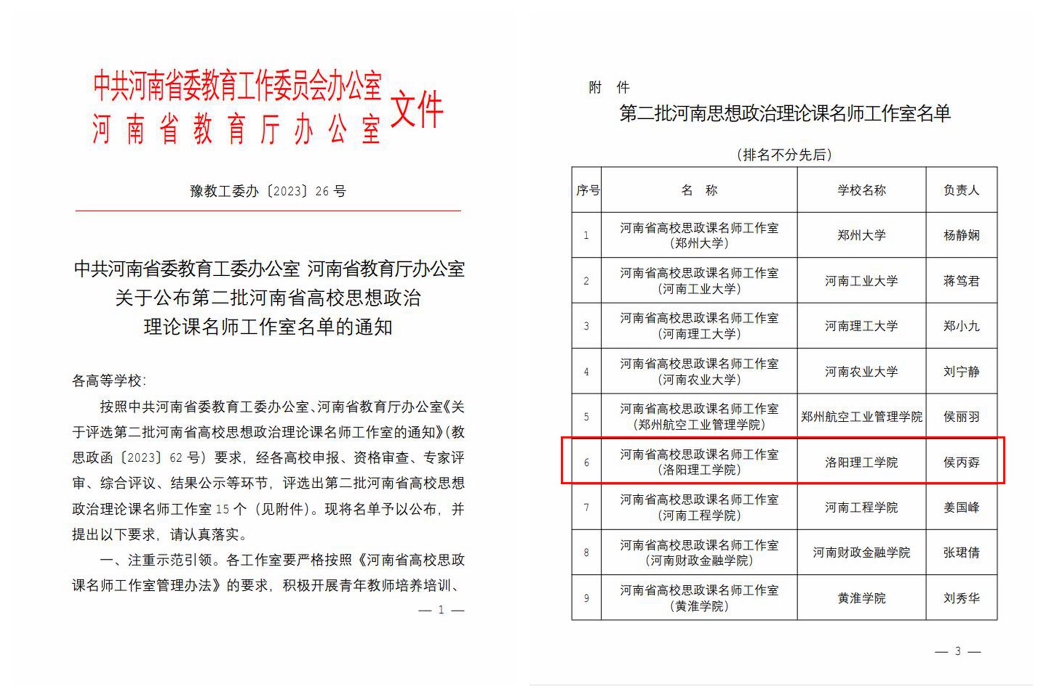 近日,河南省委教育工委办公室、河南省教育厅办公室公布了第二批河南省高校思想政治理论课名师工作室名单。我校马克思主义学院侯丙孬教授负责的思政课名师工作室获批“河南省高校思想政治理论课名师工作室”。