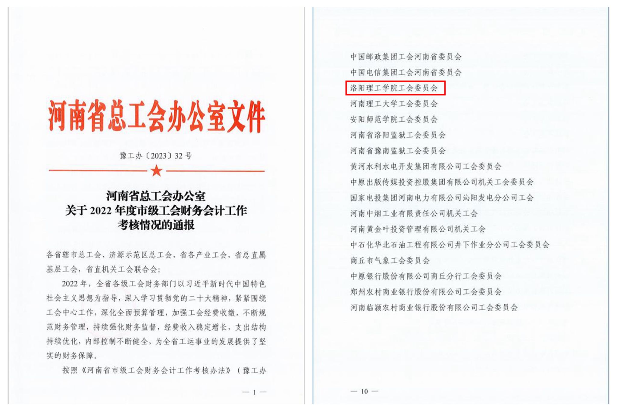 近日,河南省总工会办公室下发《河南省总工会办公室关于2022年度市级工会财务会计工作考核情况的通报》(豫工办〔2023〕32号),我校工会被评为“2022年度河南省工会财务会计工作先进集体”。