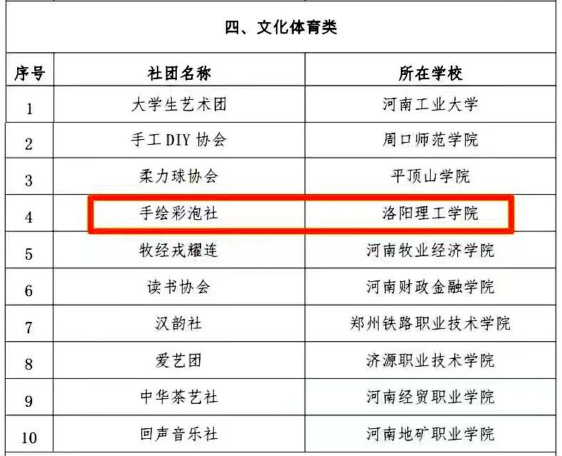 近日,中共河南省委教育工委、河南省教育厅发布了2023年全省高校“十佳学生社团”评选结果,我校手绘彩泡社在全省100余所高校近千个社团中脱颖而出,获评河南省高校“十佳学生社团”(文化体育类)。