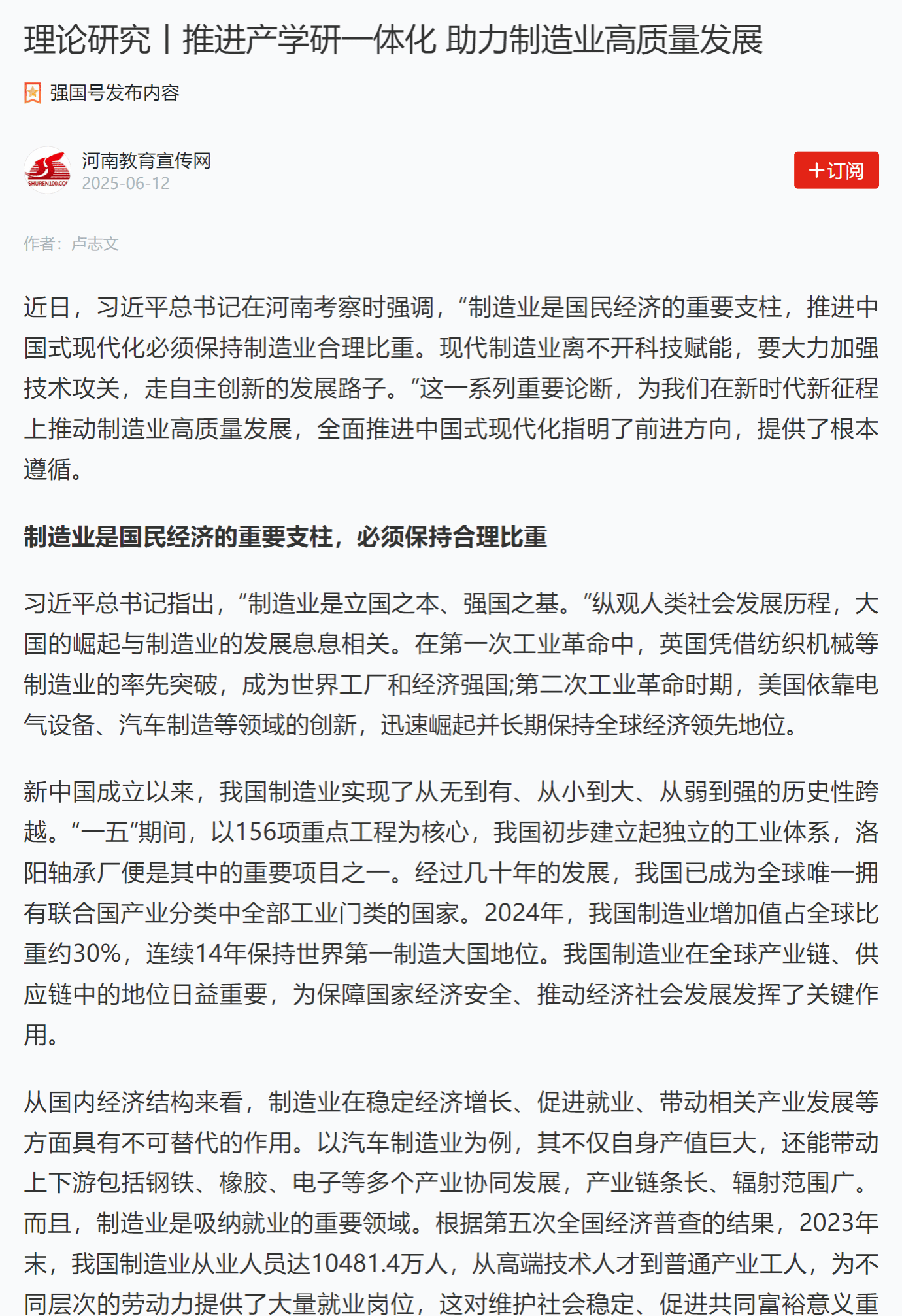 学习强国平台,2025年6月12日,《推进产学研一体化 助力制造业高质量发展》