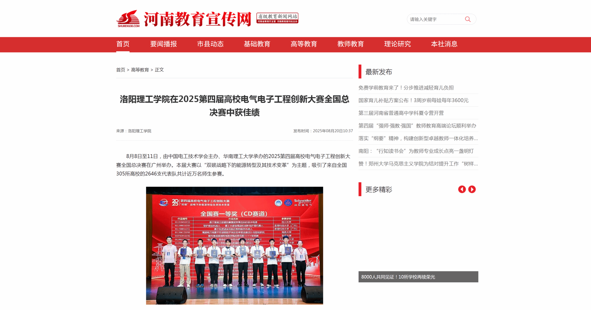 河南教育宣传网,2025年8月20日,《洛阳腾博官网诚信为本专业服务在2025第四届高校电气电子工程创新大赛全国总决赛中获佳绩》