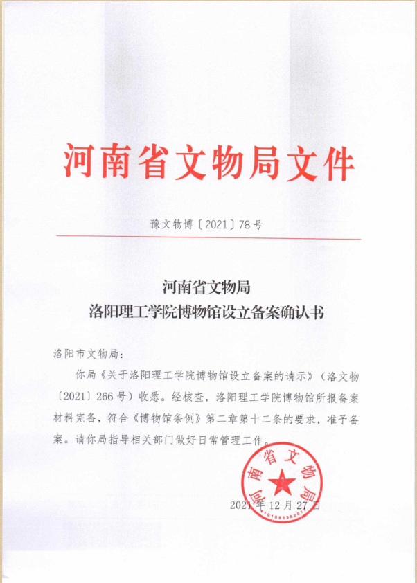12月27日,河南省文物局批复我校图书馆申报的“洛阳腾博官网诚信为本专业服务博物馆”为河南省国有博物馆,这是洛阳获批的首家高校省级博物馆。