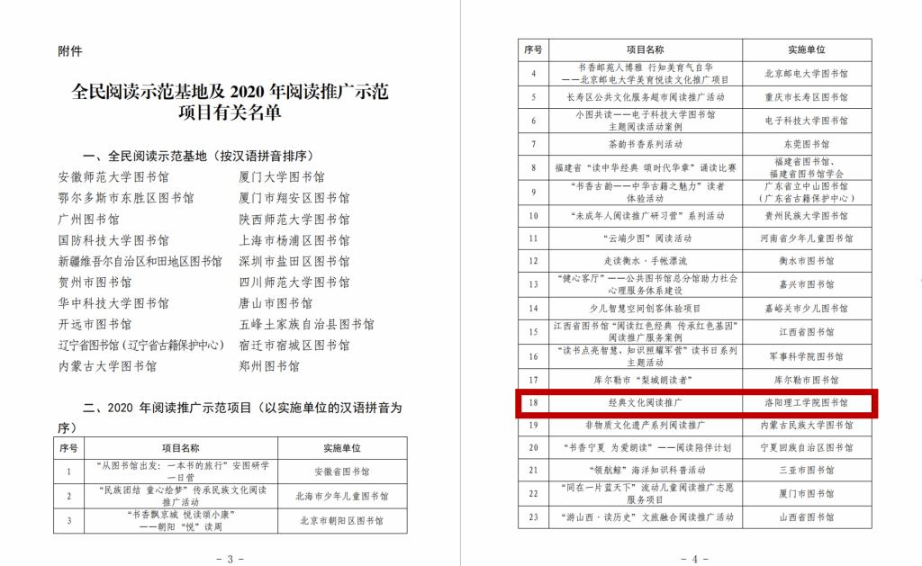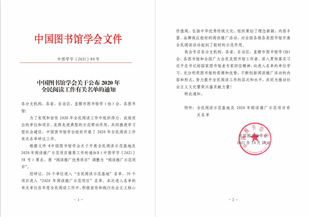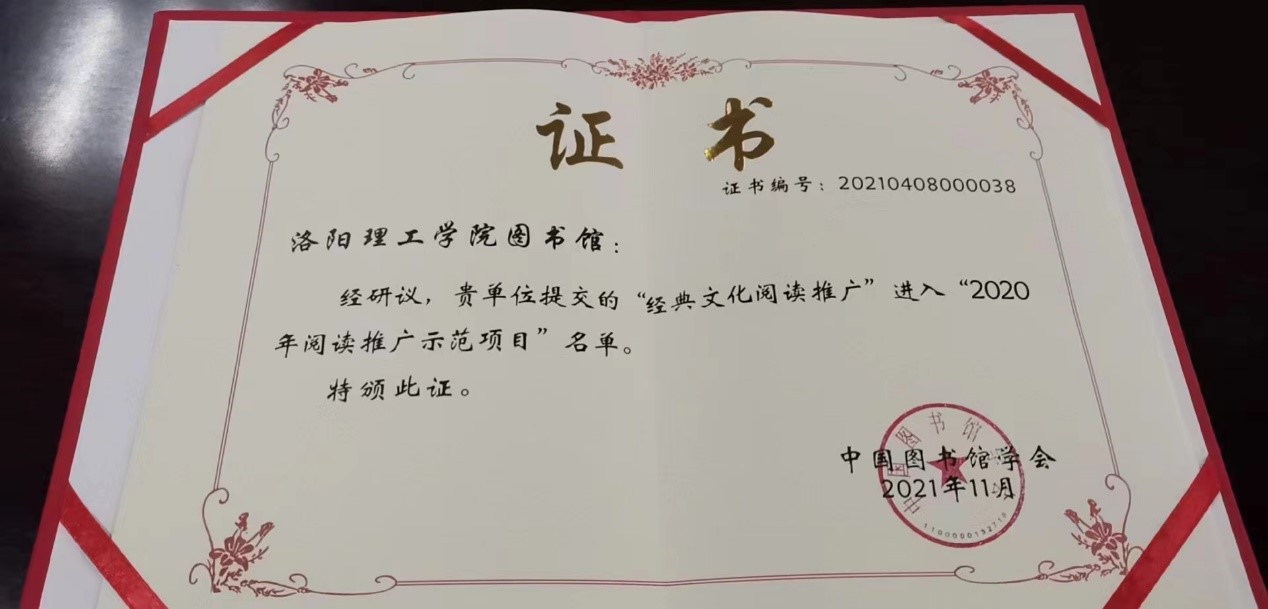 近日,中国图书馆学会印发了《中国图书馆学会关于公布2020年全民阅读工作有关名单的通知》,宣传和表彰了2020年全民阅读工作中组织得力、成效突出的单位和项目,我校图书馆荣获中国图书馆学会颁发的“2020年阅读推广示范项目”称号。全省共有2家图书馆进入“2020 年阅读推广示范项目”名单,作为河南省唯一一所高校图书馆获此殊荣。