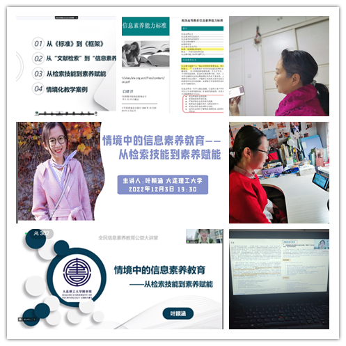 为提升广大教师对教育信息化的理解、认识、知识、技能及应用等基本素养,2022年12月3日图书馆积极组织馆员线上举行第三期“全民素养大讲堂:情境中的信息素养教育——从检索技能到素养赋能”讲座。