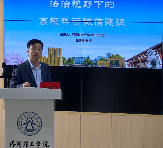 4月28日下午,河南科技大学图书馆馆长杨连专教授受邀在王城校区智慧教室AE507作题为《法治视野下的高校科研诚信建设》的专题讲座,我校图书馆全体人员及科研处、学校各院部教师代表参加了讲座。