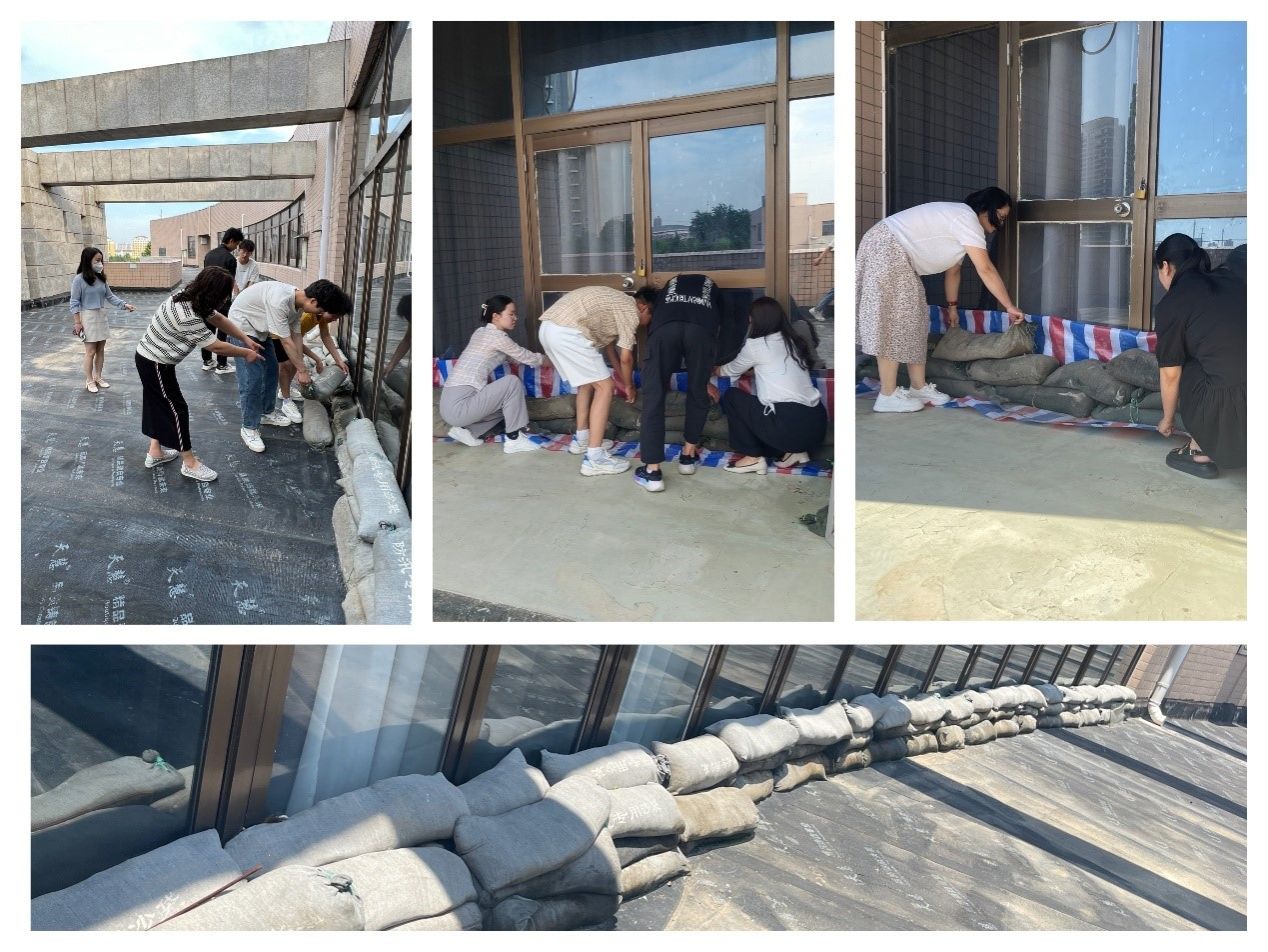 阅览部主任杨琳及特藏部副主任王针臻积极响应馆领导指示,组织部门管理人员对开元校区图书馆进行了全方位排查,重点查看了图书馆五楼、一楼消防通道等易积水容易进水的窗户、露台、消防通道等,检查了排水口的清理情况,同时用防汛沙袋对重点防汛点位进行加固;排查图书馆水电、门窗、墙面等设施设备,全方位强化隐患排查治理,做好防汛应急措施,严防强降雨带来洪涝和其他次生灾害。