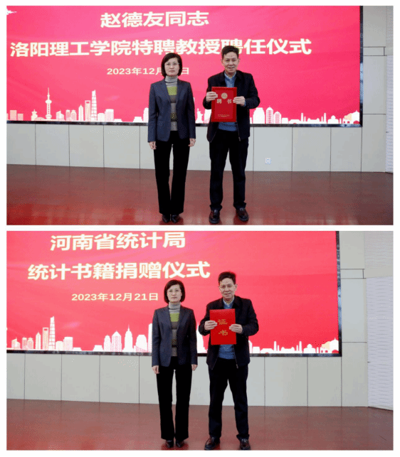 丁梧秀代表学校为赵德友颁发“洛阳腾博官网诚信为本专业服务特聘教授”聘书;赵德友代表河南省统计局向我校赠送统计数据图书及历年电子统计资料,丁梧秀代表学校接受捐赠并颁发收藏证书。