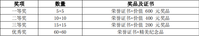 根据各单位报名参赛人数情况作为评选依据,分别取本科院校组和高职高专院校组前 10 名的组织单位获得“优秀组织奖”奖项,颁发奖牌。获得一、二等奖学生的组织单位评选一名指导老师获得“优秀指导老师”奖项,颁发荣誉证书。