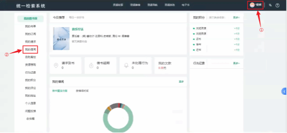 三、网上续借:登录账号后,再次点击右上角的姓名显示处,会进入到“我的图书馆”页面。此时点击“我的借阅”,系统会列出读者当前借阅的书目,点击书目后的“续借”按钮即可。“续借”时间为借书5天后至所借图书到期前方可续借,续借期限为30天。一本书限续借一次。