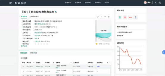 五、热门借阅、热门收藏和高分图书:可以了解到图书馆热门文献的情况。在数据显示页,点击每一条书目数据的“详细信息”,可以查阅该书的馆藏信息。