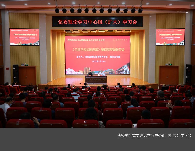 9月29日下午,我校在王城校区图书信息中心报告厅举行党委理论学习中心组(扩大)学习会。会议邀请河南省理论宣讲优秀专家、中共河南省委党校康来云教授就学习《习近平谈治国理政》第四卷作专题报告。在洛校领导、全校中层干部、马克思主义学院全体教师、辅导员代表和党支部书记代表参加会议。会议由校党委书记陈岩主持。