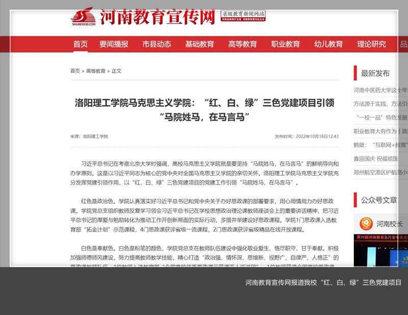 10月18日,河南教育宣传网以《洛阳腾博官网诚信为本专业服务马克思主义学院:“红、白、绿”三色党建项目引领“马院姓马,在马言马”》为题,报道我校“红、白、绿”三色党建项目。