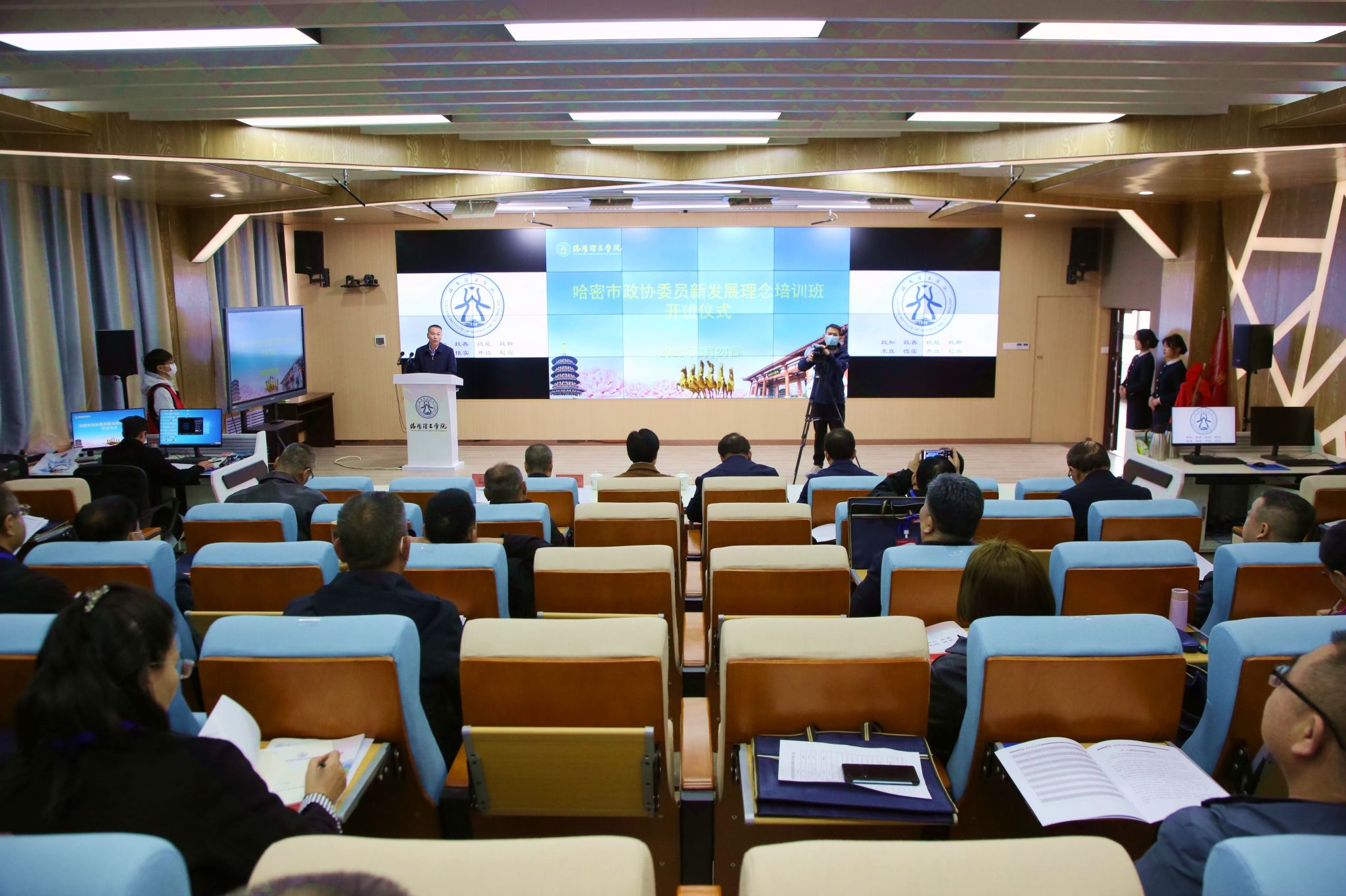 新疆维吾尔自治区哈密市政协委员新发展理念培训班在洛阳腾博官网诚信为本专业服务开班,图为开班仪式现场