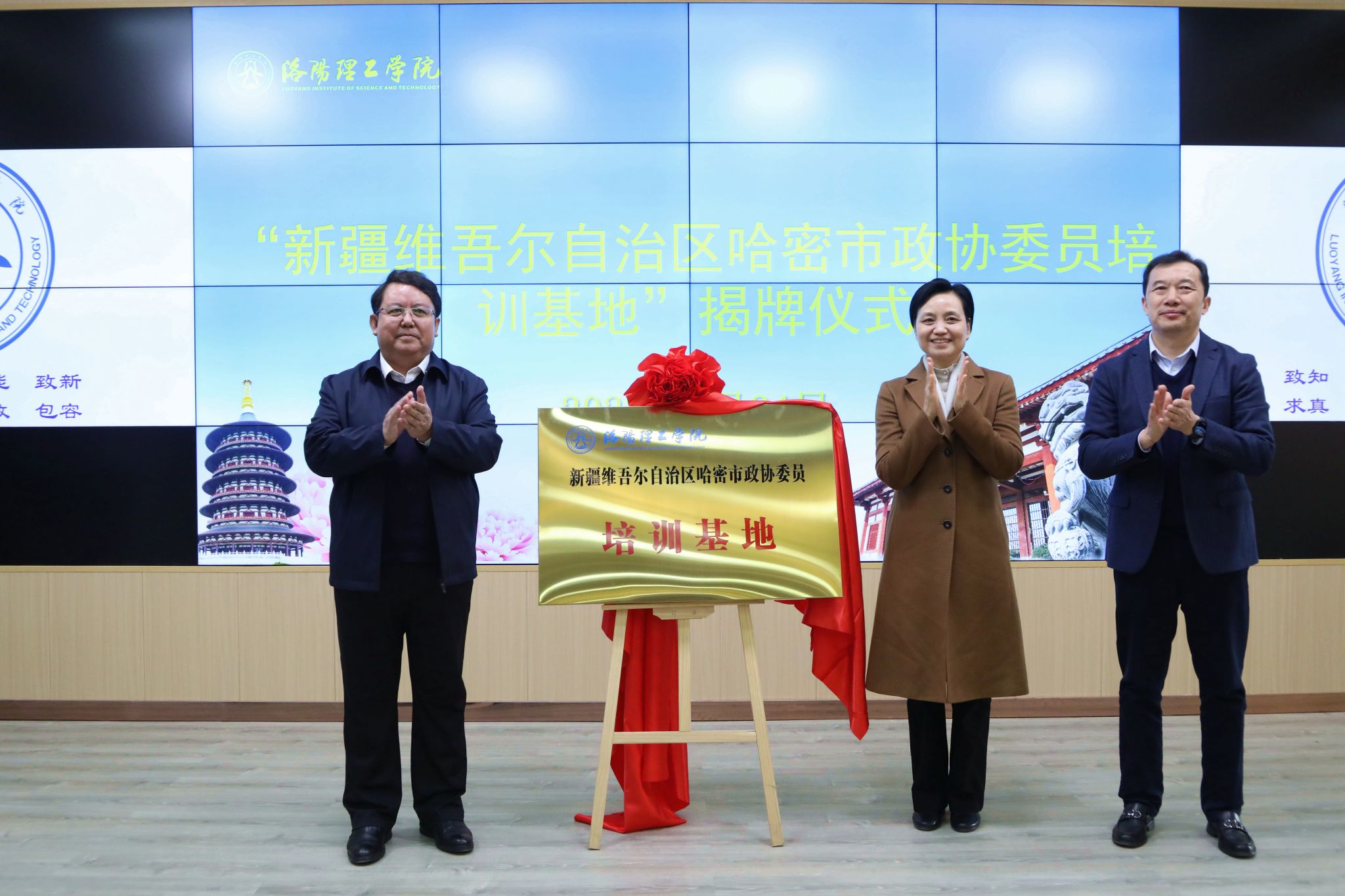 哈密市政协副主席热哈提?艾力别克、洛阳市政协副主席陈淑欣、校党委书记陈岩共同为“新疆维吾尔自治区哈密市政协委员培训基地”揭牌