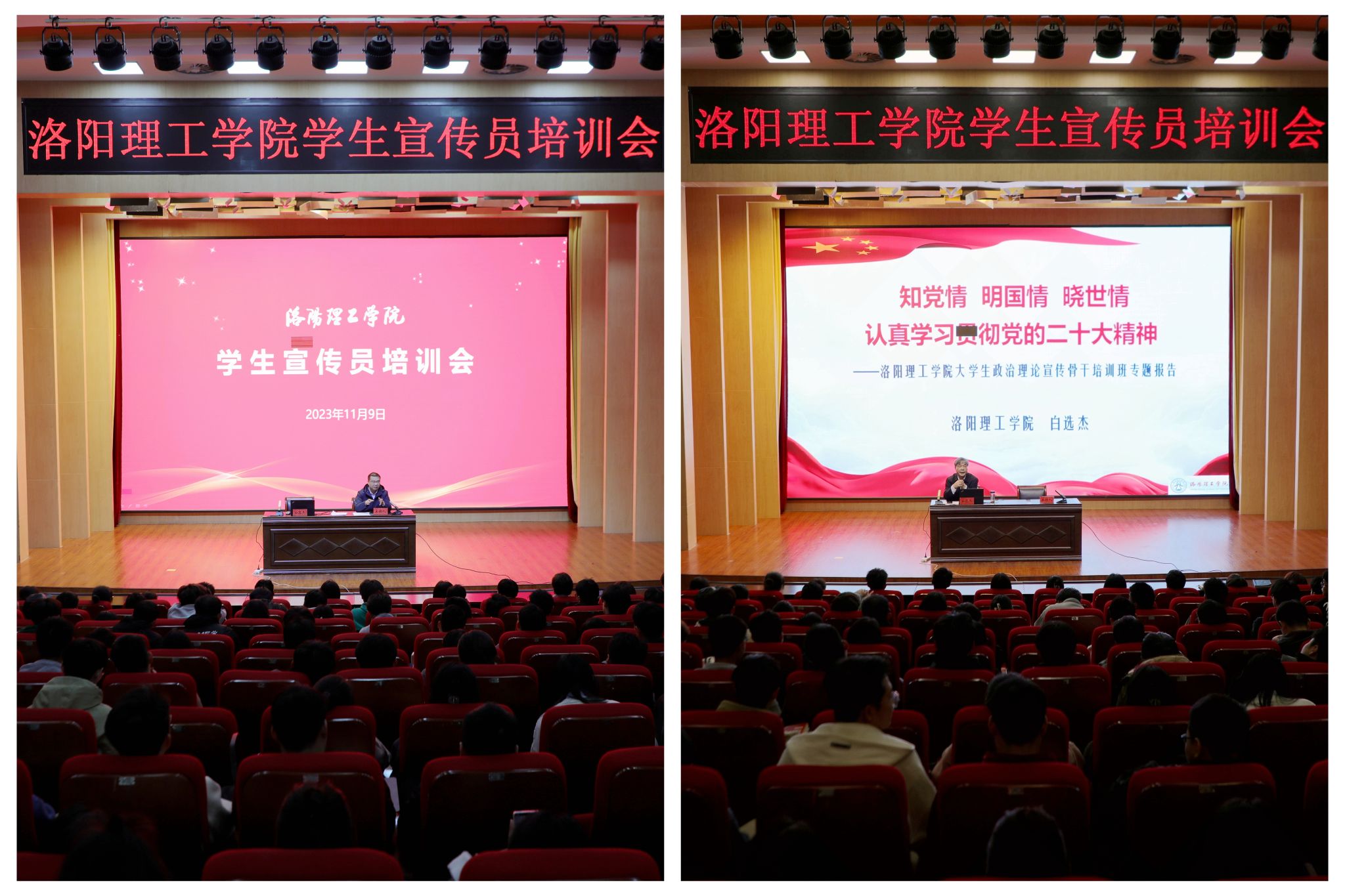 11月9日下午,洛阳腾博官网诚信为本专业服务大学生思想政治理论宣传骨干培训暨党的二十大精神宣讲报告会在王城校区图书信息中心报告厅举行,会议邀请河南省青少年德育优秀宣讲专家、洛阳市委宣讲团成员、我校退休教师白选杰教授作党的二十大精神专题报告。党委宣传部工作人员和全校200余名学生宣传员参加会议。培训会由党委宣传部相关负责同志主持。