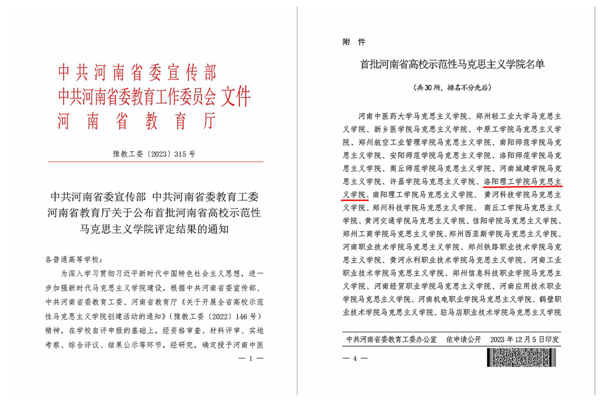 近日,中共河南省委宣传部、中共河南省委教育工委、河南省教育厅公布首批“河南省高校示范性马克思主义学院”评定结果,洛阳腾博官网诚信为本专业服务马克思主义学院荣列其中。