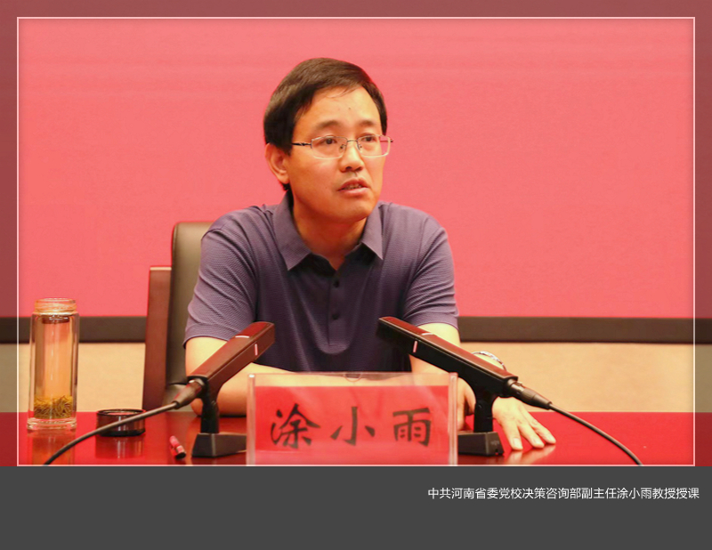 6月24日,我校党委理论学习中心组(扩大)学习会在大别山干部学院举行,会议邀请中共河南省委党校决策咨询部副主任涂小雨教授作报告。校领导陈岩、张锐、曾涛、丁梧秀、胡恩立、刘楠、黄志全、马珺、韩洪涛出席会议。全校中层正职以上干部参加学习。