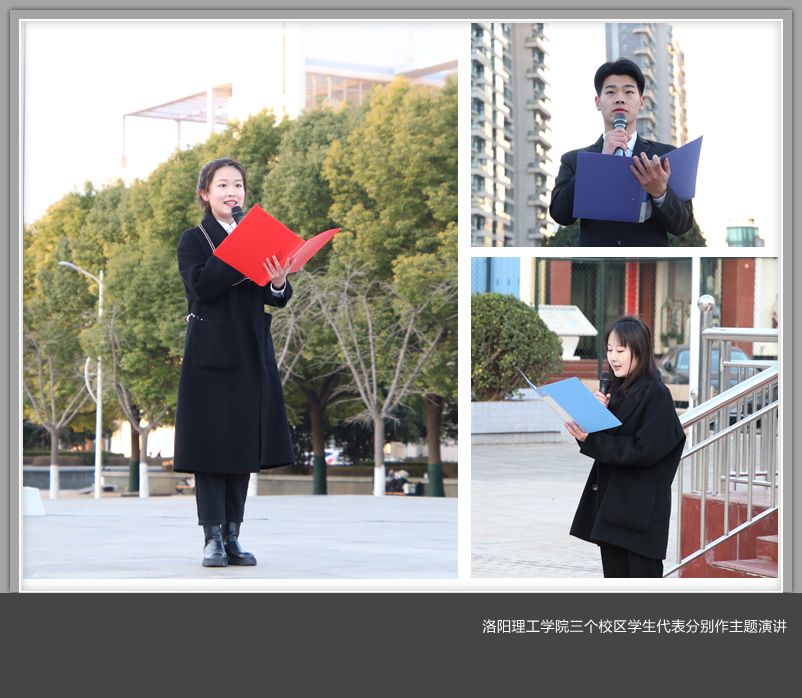 升旗仪式后,校学生团委副书记牛帅、校学生会主席团成员潘雅琪、艺术设计学院学生团委副书记侯佳雯三名学生代表分别在三个校区进行了题为《以吾辈之青春开创盛世之中华》的主题演讲,号召广大学生在民族复兴的壮阔征程上,勇担重任,明心立志,在搏击青春中放飞人生梦想,在投身民族复兴伟业中书写绚烂青春!(图:郎泽楷 王文婷 王艺霏 王茜 刘建航 孙政 卢师情)