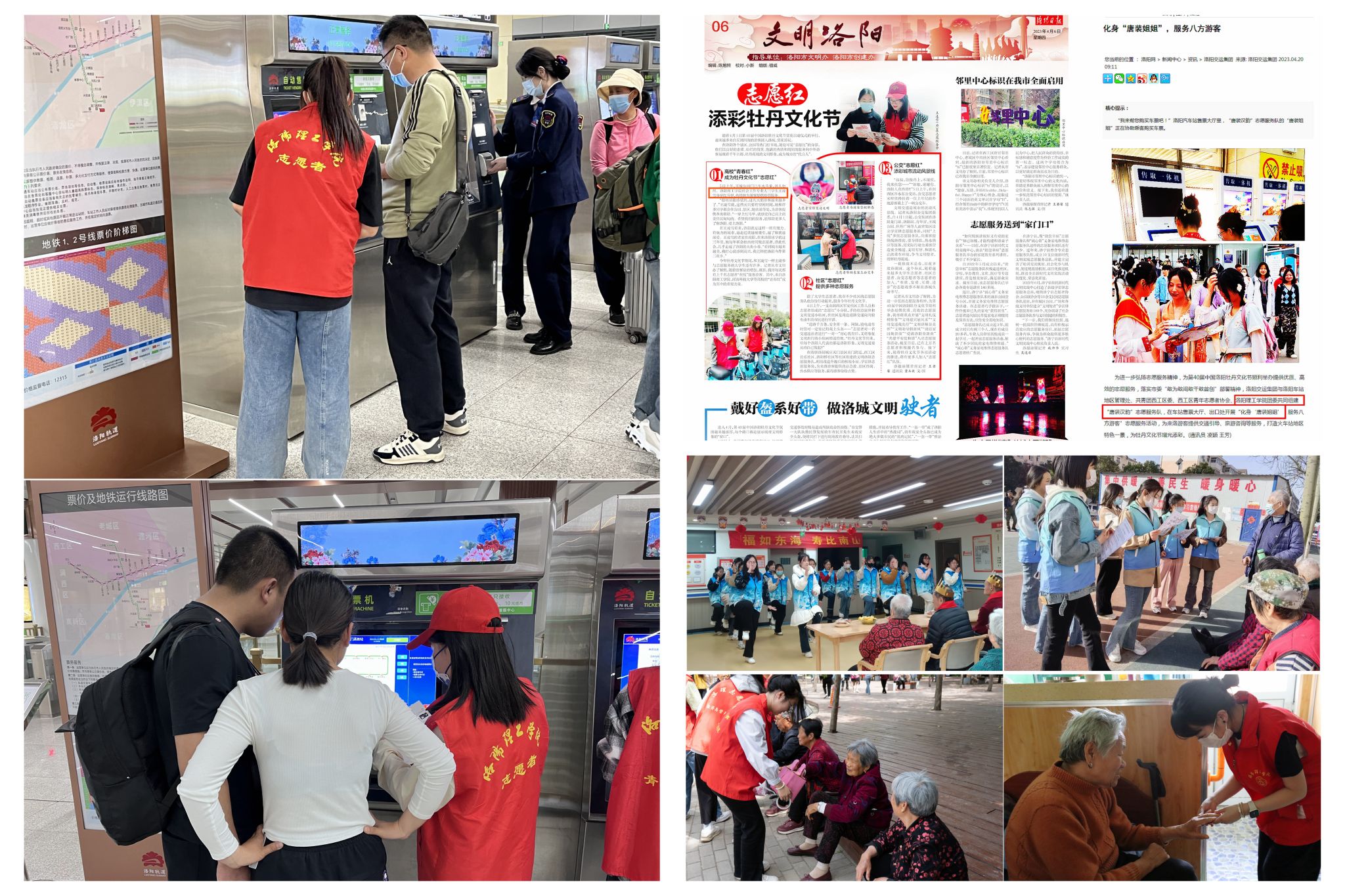 爱心“注红”,特色服务回馈社会。牡丹文化节期间,我校志愿者积极参与了各类“文明引导”志愿服务,服务人次达到三千人次,以“志愿红”助力书写人民幸福的洛阳答卷。我校志愿者在主要景区门口、高铁站口,为旅客答疑解惑,在地铁口耐心地帮助乘客熟悉自动购票机的使用方法、洛易行APP的注册流程,用优质的服务为旅客们的出行保驾护航。我校广播站、汉服社的志愿者身着汉服在地铁车厢内、长途汽车站,进行洛阳景点、诗词文化的沉浸式讲解,讲好洛阳的历史故事,丰富市民及旅客对传统文化、景区景点背后蕴藏的诗词故事、深厚的文化底蕴的了解,让更多的旅客了解洛阳、爱上洛阳,相关活动受到《洛阳日报》、洛阳网、文明洛阳的报道,形成良好的社会效果。