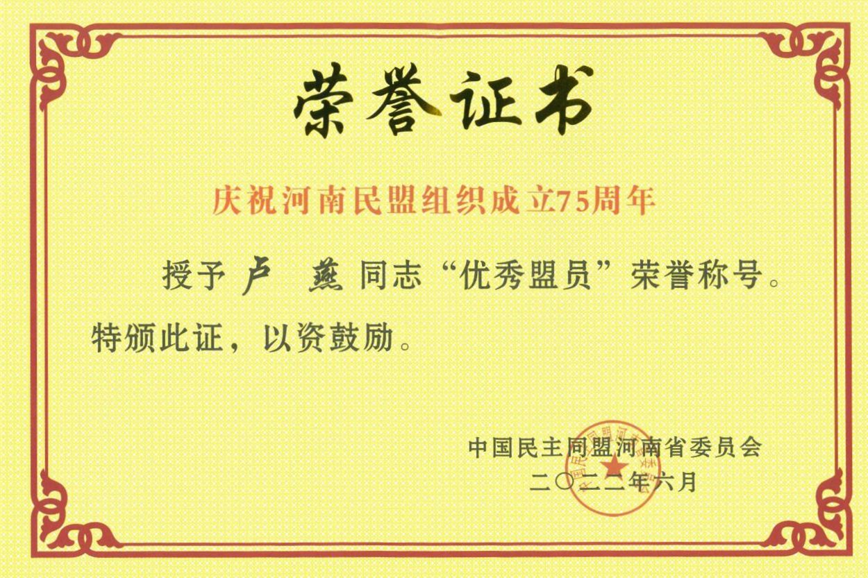 国际交流合作处处长、民盟洛阳市委员会委员卢燕被民盟河南省委评为“优秀盟员”