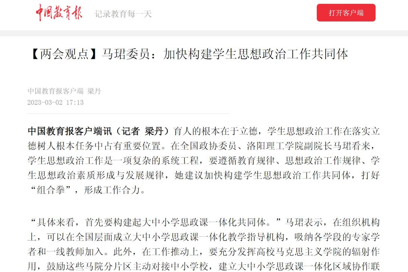 3月2日,《中国教育报》、《河南日报》、《大河报》等媒体分别就全国政协委员、我校副校长马珺参加今年全国两会作出相关报道。其中,《中国教育报》客户端【两会观点】专题报道了马珺就“加快构建学生思想政治工作共同体”谈及的一些观点和看法;《河南日报》客户端以《启程!住豫全国政协委员赴京参会》为题作了跟团报道,并对马珺进行采访;《大河报》豫视频在H5融媒创意产品《向春天进发——我与河南高铁的故事》系列报道中采访了马珺等多名住豫全国人大代表、政协委员。