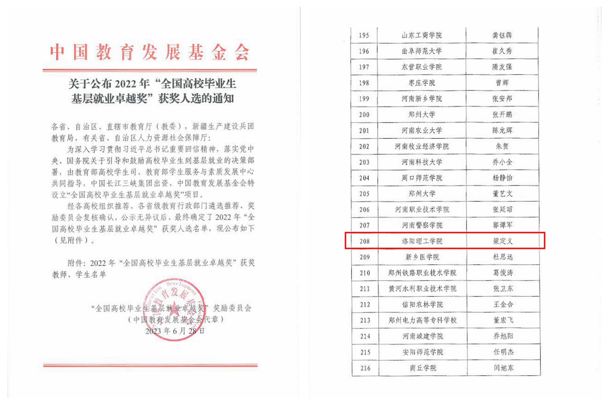 洛阳腾博官网诚信为本专业服务毕业生梁定义荣获2022年“全国高校毕业生基层就业卓越奖”,图为表彰文件及获奖名单(部分)