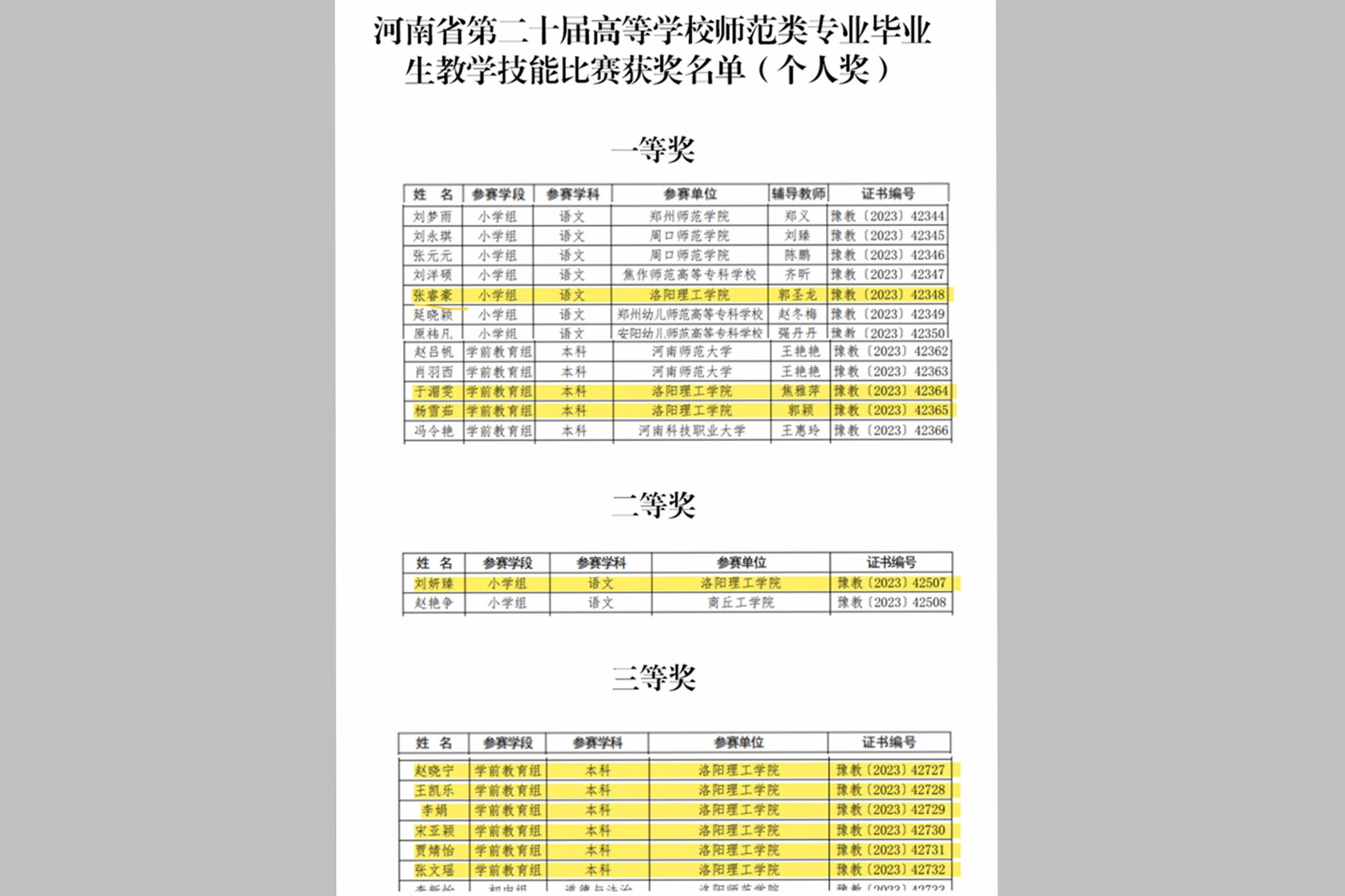 我校毕业生在河南省第二十届高等学校师范类专业毕业生教学技能比赛中获佳绩,图为获奖名单(部分),标黄部分为我校毕业生获奖情况