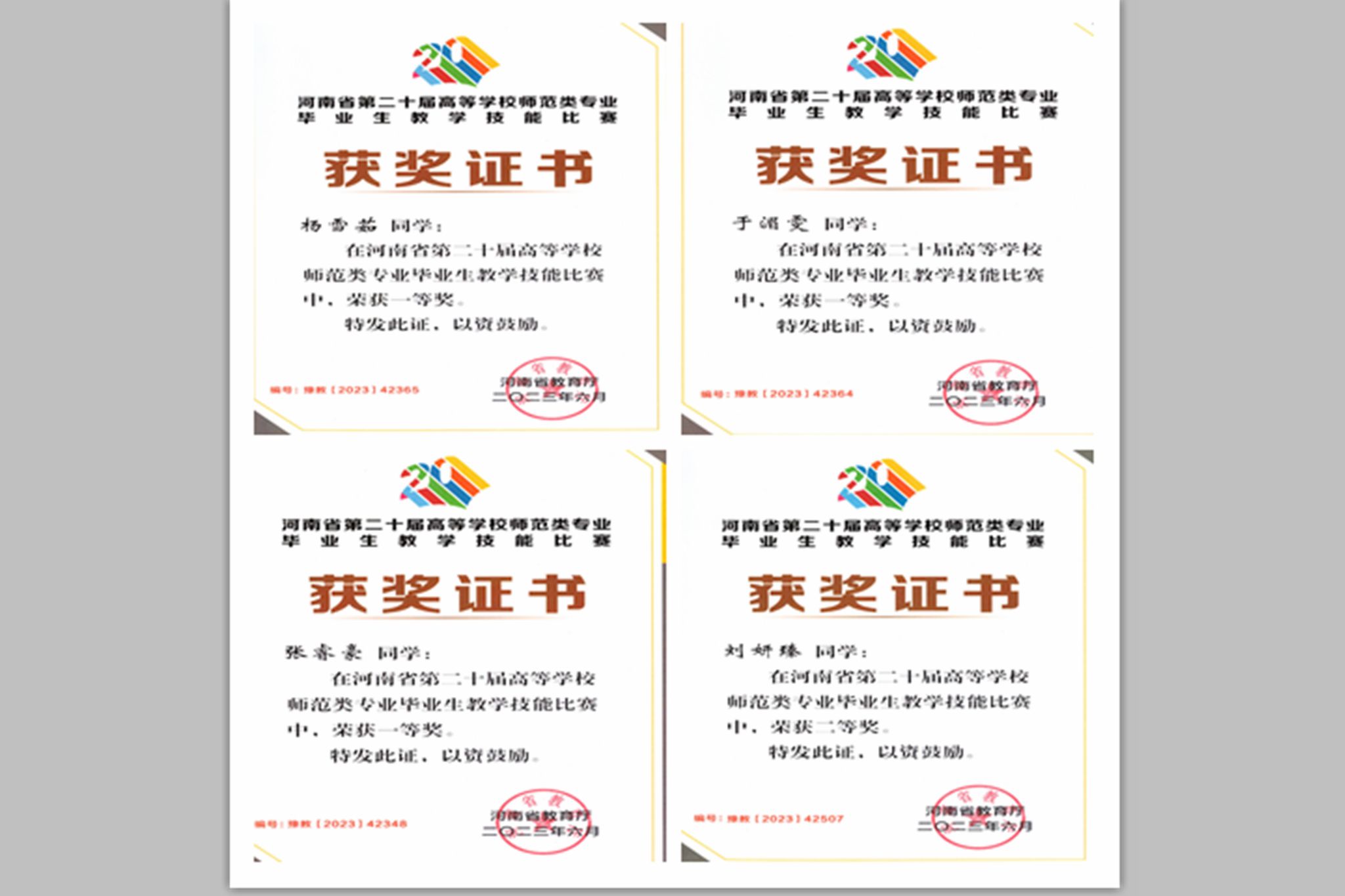 近日,河南省教育厅公布河南省第二十届高等学校师范类专业毕业生教学技能比赛结果,我校教育科学与音乐学院4名参赛选手共获得一等奖3项、二等奖1项。其中,学前教育专业于湄雯、杨雪茹同学和小学教育专业张睿豪同学分别荣获一等奖;小学教育专业刘妍臻同学荣获二等奖;焦雅萍、郭颖、郭圣龙3位教师荣获“优秀指导教师”。