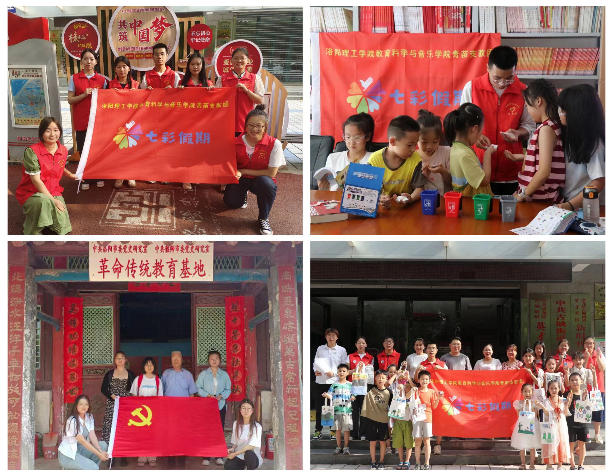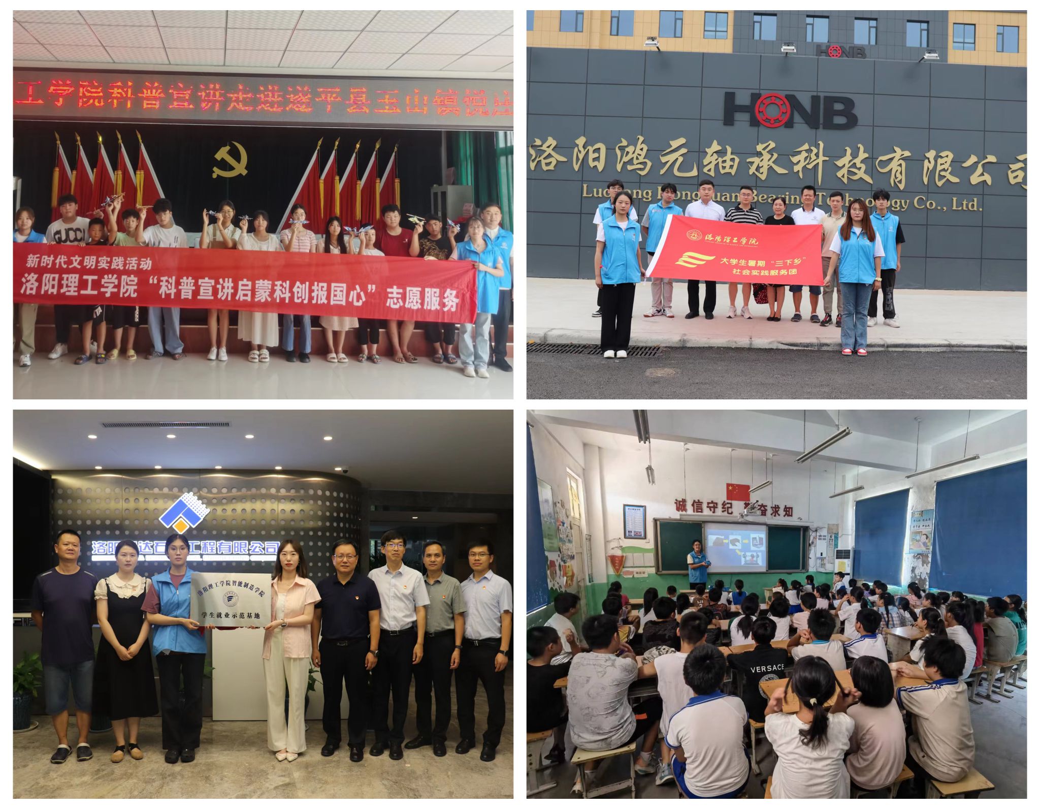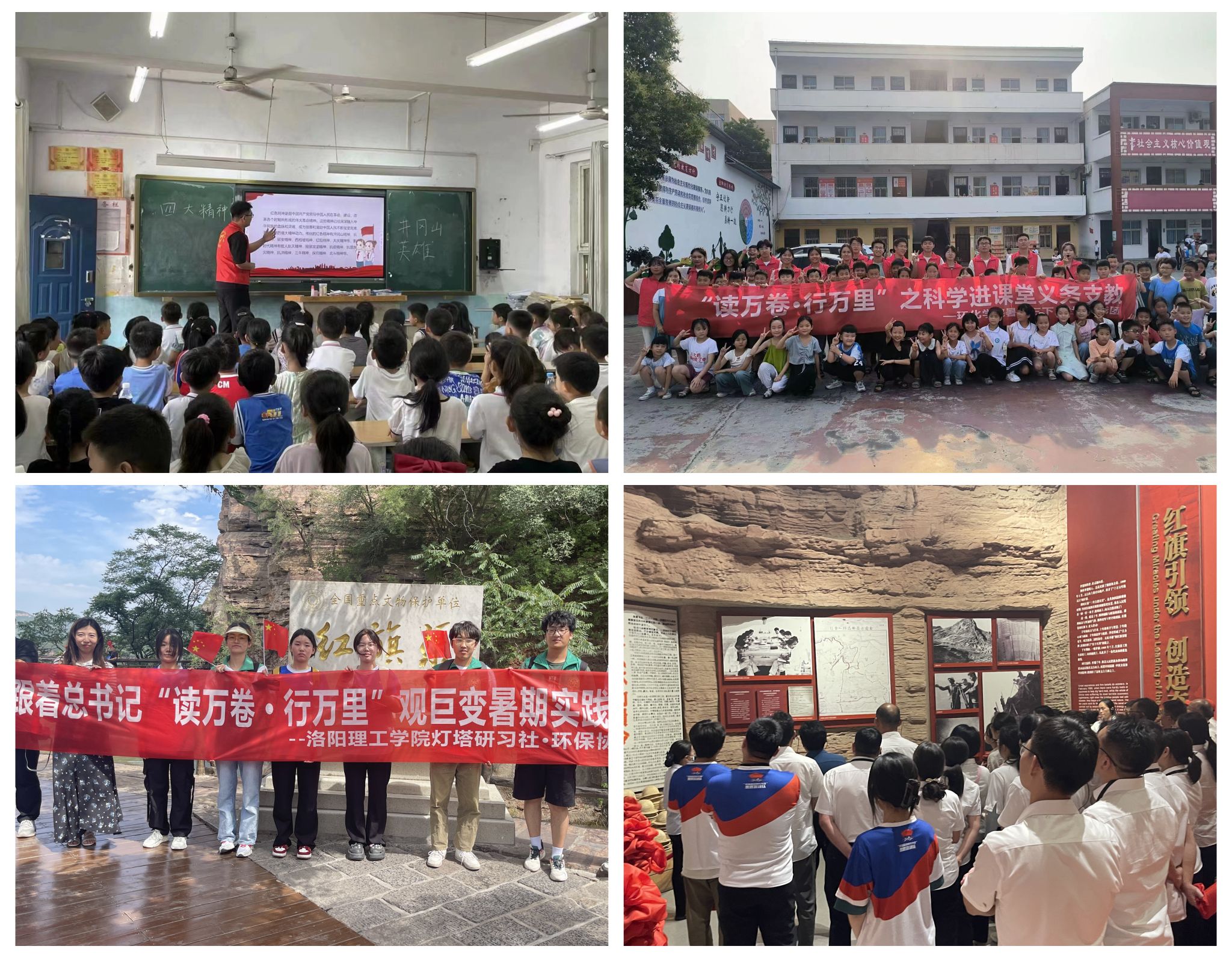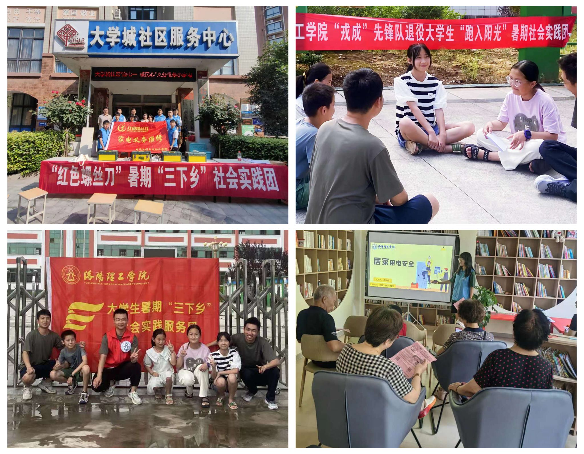 “星火燎原”暑期社会实践团于6月22日前往张家界桑植县开展主题宣讲;6月28日在洛阳市涧西区科技馆参观“两弹一星”相关科技成果,深入了解了“两弹一星”精神对航天事业发展的重要意义;7月20日前往郑州市十八里河街道青翠路社区,开展“星火接力,丹心筑梦”主题志愿活动,宣传和传承“两弹一星”精神。“红色星火”暑期社会实践团于6月16日在洛阳市南昌路小学开展志愿宣讲并教授小朋友们绘制自己心中的红旗渠精神;7月31日在郑州青翠路社会为社区学生开展专题宣讲,培养小小少年历史责任感。“河洛非遗青年行”暑期社会实践团先后探访河南省非物质文化遗产项目唐白瓷烧制技艺、国家级非物质文化遗产唐三彩烧纸技艺并对过程进行拍摄记录,助力河洛非遗文化传播发展。“以纹之铭探索千年河洛密码”实践团于7月13日与青翠路社区共同举办了“剪古绘新,传承文化”活动,激发了学生们对优秀传统文化的兴趣和创新动手能力。 “后浪育新”志愿服务团队两次前往宜阳县香鹿山镇后庄小学,开展暑期非遗剪纸课程,服务农村未成年人传承优秀传统文化。“破核守康”志愿宣讲队于7月26日与涧西区疾控中心、洛阳市东方医院、武汉路第一社区联合开展“防治肺结核”知识宣讲活动。