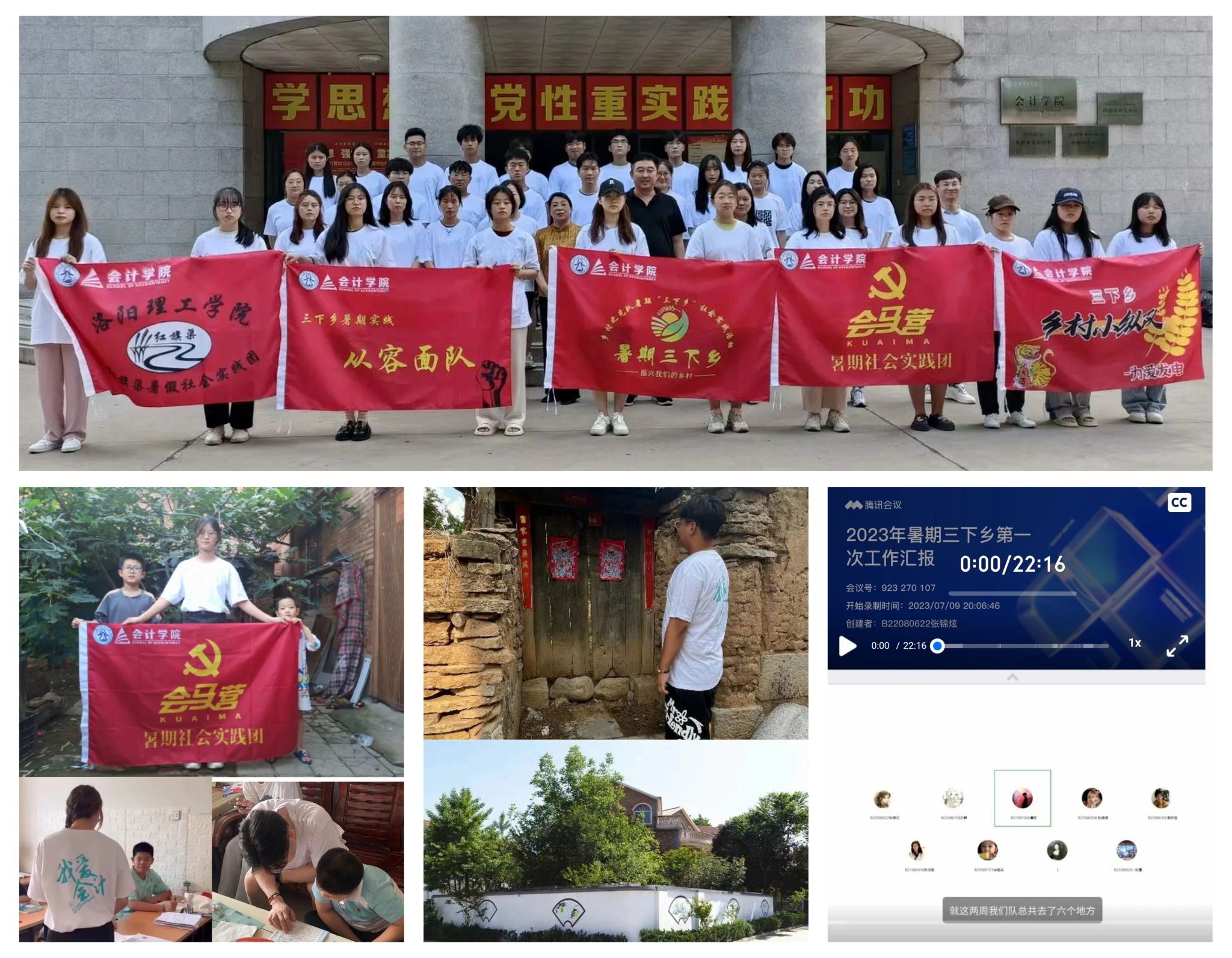 6月29日,会计学院在开元校区D楼楼下启动暑期三下乡出征仪式,会计学院党委书记赵燕昌嘱咐学生在保障安全的前提下,利用暑假实践了解国情,深入群众,深入基层,做心怀祖国的有志青年。7月,会计学院9支暑期社会实践队陆续出发,地域跨越11个省份,累计开展16次暑期实践活动,实践内容涵盖关心农村青少年心理成长和帮扶、具有专业特色的红色会计党史学习教育、关注乡村振兴下村容村貌、群众住房改善的基层走访、关注农村经济作物的市场调研、洛阳红色文化党史宣讲等。7月初,“会马营——观乡村巨变传理论知识、助青少年成长”实践团奔赴吉林省吉林市永吉第二中学、浙江省萧山区河上镇进行“未来种子计划”互动式宣讲,为青少年普及未成年保护法、团的历史,传递团员榜样力量,建立心理自信。7月10日-13日,“青春奉献在乡村,推动乡村振兴发展”暑期实践团成员分别奔赴安徽濉溪县、周口西华县、安阳采桑村等5个村庄,深入基层整理50年来农村住房、村容村貌的情况,感悟乡村振兴带来变化。为加强实践团之间经验沟通,协助解决学生暑期三下乡困境,会计学院每两周召开一次三下乡进展讨论会,实践团成员分享参与社会实践过程中的所见、所思、所想,对当前乡村振兴建设中,存在一定程度的青年干部力量缺失达成共识,实践团部分成员表示愿意在毕业后投身乡村基层工作,为乡村振兴贡献青年力量。