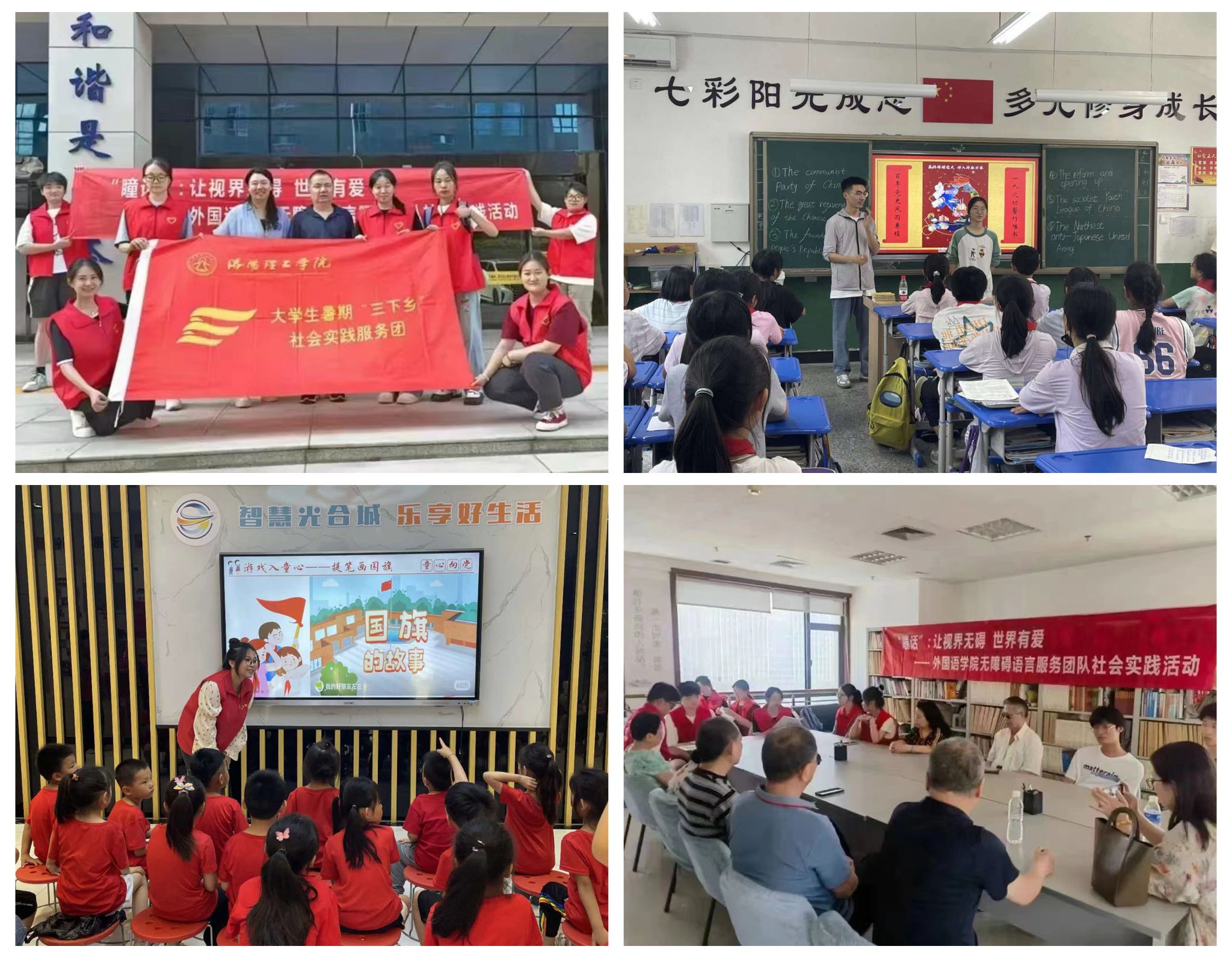 总共有五支团队,一是“瞳话”实践团队前往洛阳市特殊教育中心学校,通过口述影像为特殊教育中心学校20多名视障学生进行无障碍语言服务,二是以“衷诉辉煌党史,语入神都万家”为主题的“三下乡”暑期理论普及宣讲社会实践,三是“外语颂党恩,薪火永相传”实践团前往八路军驻洛阳办事处纪念馆进行参观学习,四是弘扬红色文化实践团在郑州市登封市颍阳镇第六小学开展的支教活动,五是“双语拾遗,红色筑史”实践团结合外语特色,利用外语特长进行的文化宣讲活动。