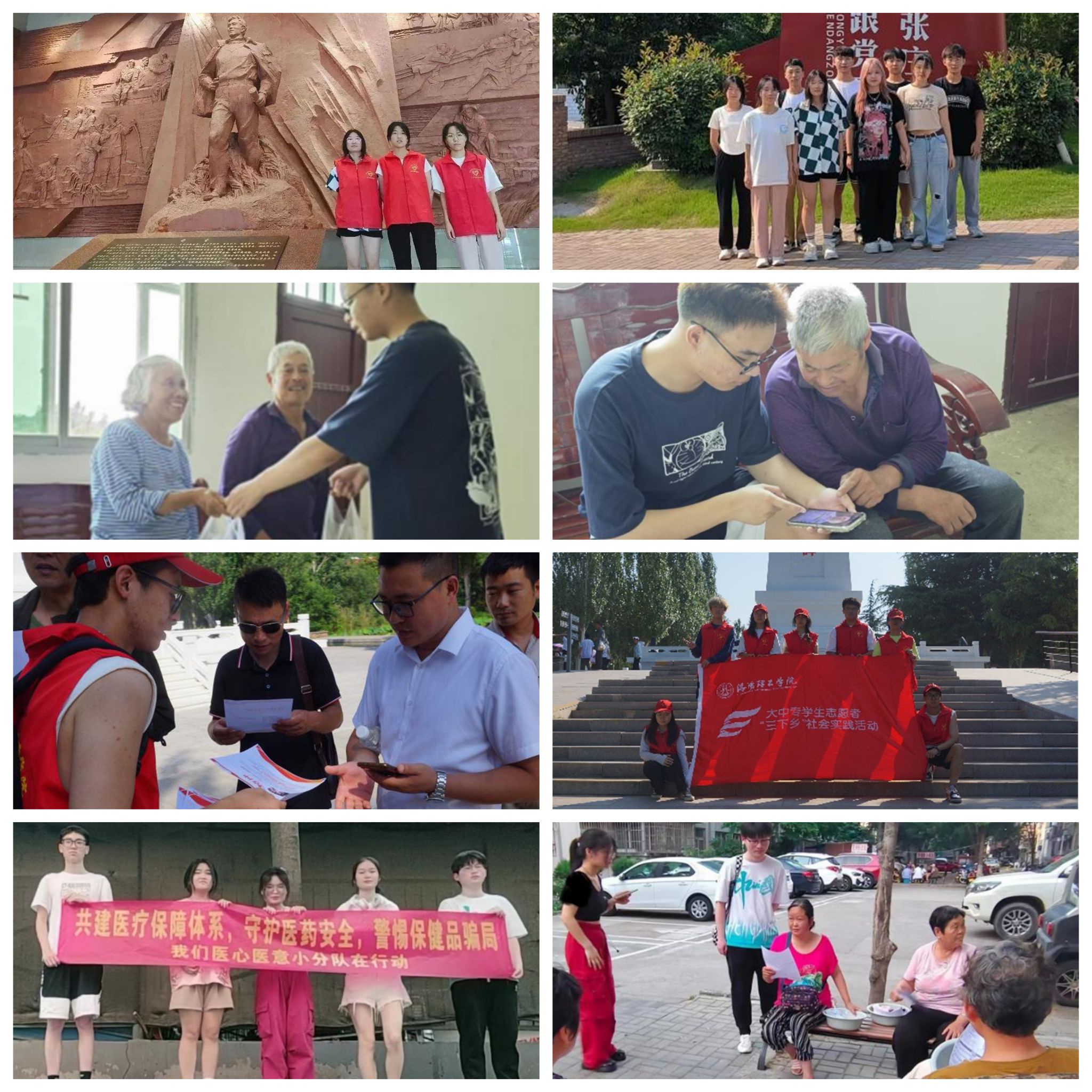 7月4日“红旗渠精神代代传”暑期社会实践团前往安阳市林州市红旗渠,学习红旗渠精神。通过参观红旗渠遗址,了解了红旗渠建设的伟大历程和红旗渠精神的内涵。团队成员表示要继承红旗渠精神,为强国建设、民族复兴贡献青年一代的力量。“医心医意”社会实践团队前往商水县卢庄村,宣传医疗保健知识,提高老年人对用药安全和保健品防诈骗的认知水平。团队成员通过宣传页和亲切交流,帮助老人们对健康管理有更全面的认识,同时意识到在农村地区普及相关知识的重要性。