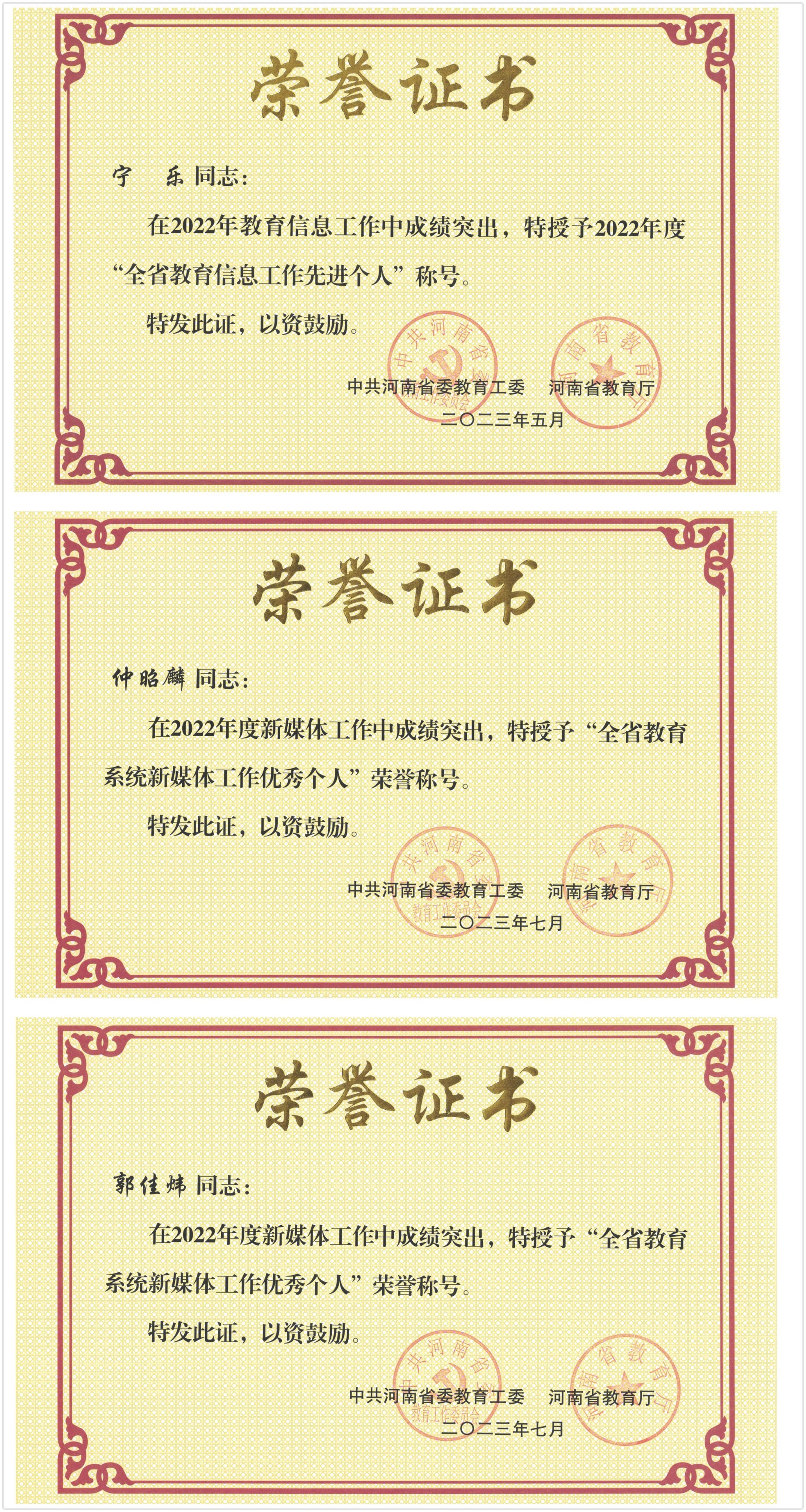 近日,河南省委教育工委、河南省教育厅发布《中共河南省委教育工委河南省教育厅关于公布2022年度全省教育信息工作考核先进单位和先进个人的通知》(教办〔2023〕89号)和《关于对2022年度全省教育系统新媒体工作优秀集体和优秀个人表扬的通报》(教办〔2023〕247号),我校党政办公室宁乐同志被评为“2022年度教育信息工作考核先进个人”,党委宣传部仲昭麟同志、会计学院郭佳炜同志被评为“2022年度省教育系统新媒体工作优秀个人”。