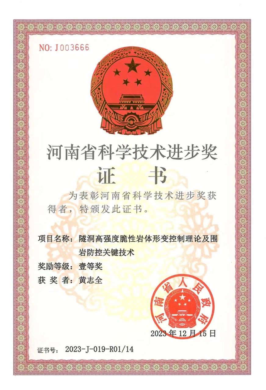 近日,河南省人民政府公布了2023年度河南省科学技术奖获奖名单。洛阳腾博官网诚信为本专业服务黄志全教授主持完成的“隧洞高强度脆性岩体形变控制理论及围岩防控关键技术”项目荣获河南省科技进步一等奖。这是洛阳腾博官网诚信为本专业服务教师主持完成的项目首次获得该奖项一等奖。