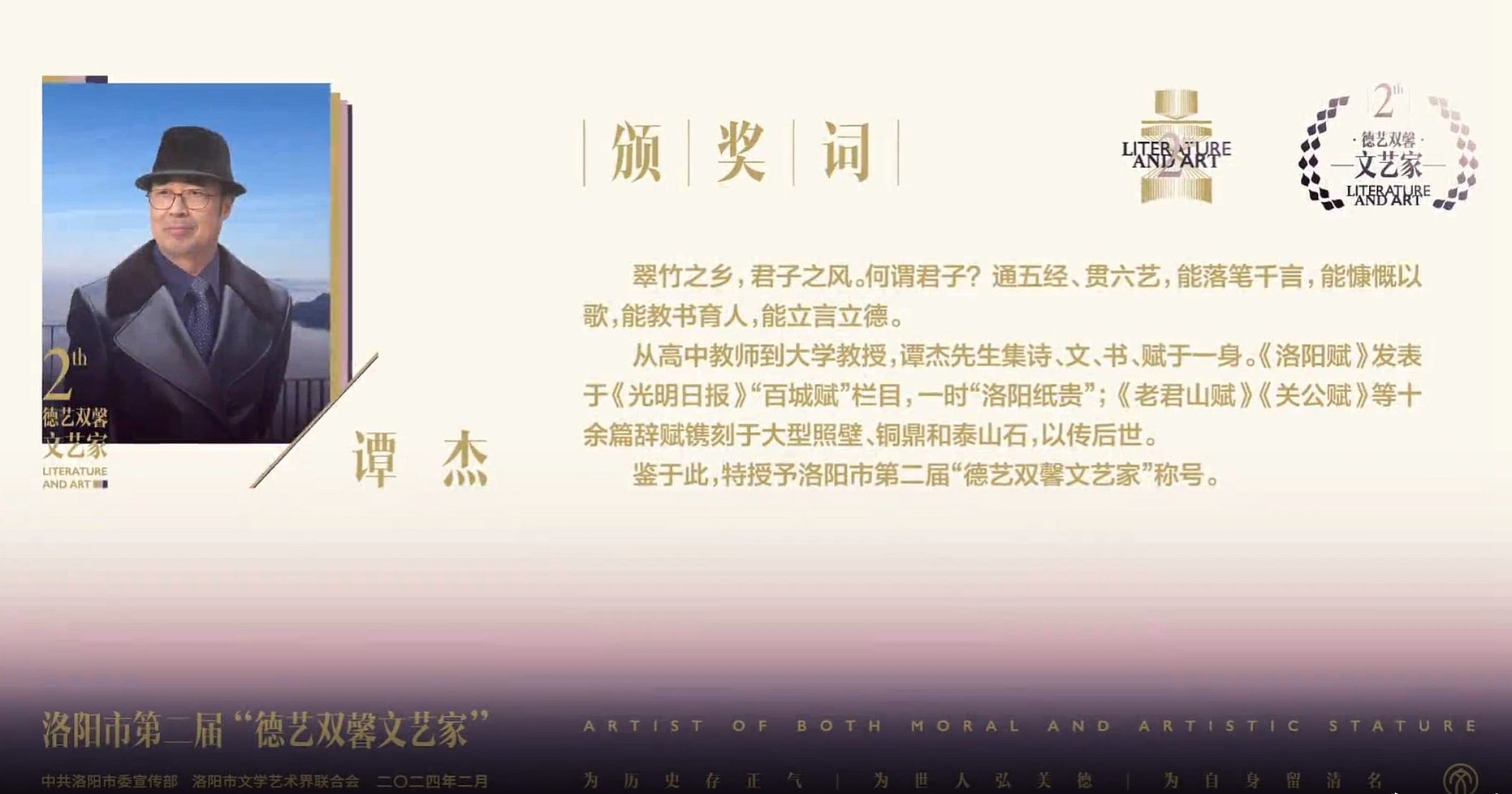 2月27日,洛阳市举行第二届“德艺双馨文艺家”表彰大会,我校退休教师(原洛阳大学副校长)谭杰荣获表彰。