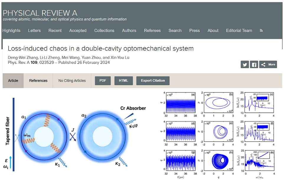近日,国际著名权威物理期刊--美国物理学会期刊《Physical Review A》在线刊登了我校数学与物理教学部教师张登威博士的最新研究成果《Loss-induced chaos in a double-cavity optomechanical system》(双腔光力系统中损耗诱导的混沌)。