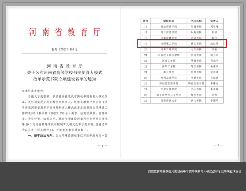我校致实书院此次成功获批,充分展现了在学校党委的领导下,我校全面贯彻党的教育方针,贯彻落实立德树人根本任务,积极探索、不断完善双院协同育人的新机制,着力构建双院协同、相辅相成、五育并举、学科专业交融的人才培养新模式,为我省高校书院制育人模式改革贡献了“洛理工力量”。