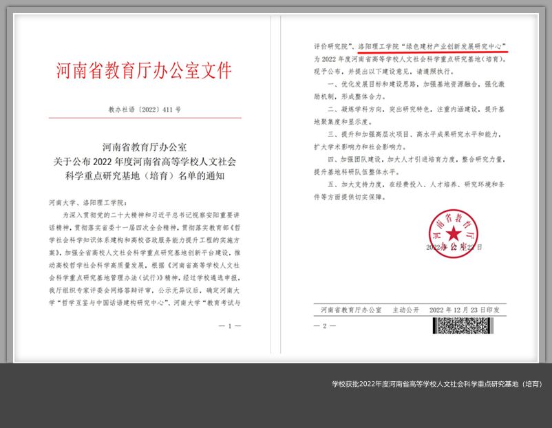 近日,河南省教育厅发布通知,公布了2022年度河南省高等学校人文社会科学重点研究基地(培育)名单,由副校长马珺教授牵头申报的“绿色建材产业创新发展研究中心”顺利入选,这是学校在省级人文社科科研平台建设上的新突破。