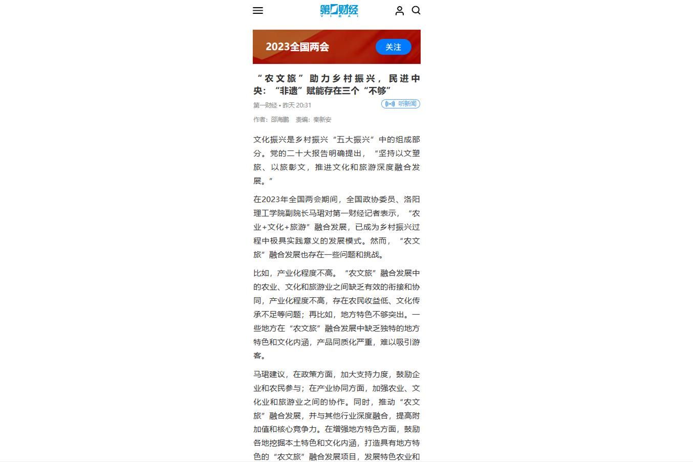 4.第1财经 2023-03-07《“农文旅”助力乡村振兴,民进中央:“非遗”赋能存在三个“不够”》: