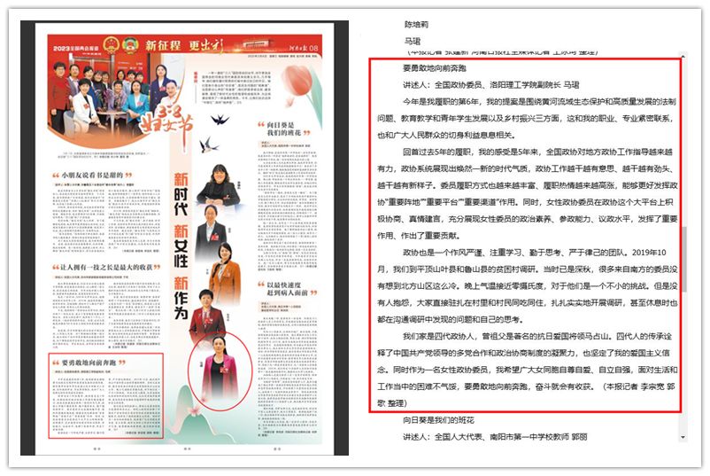 《河南日报》在三八妇女节专题中报道了全国政协委员、洛阳腾博官网诚信为本专业服务副校长马珺