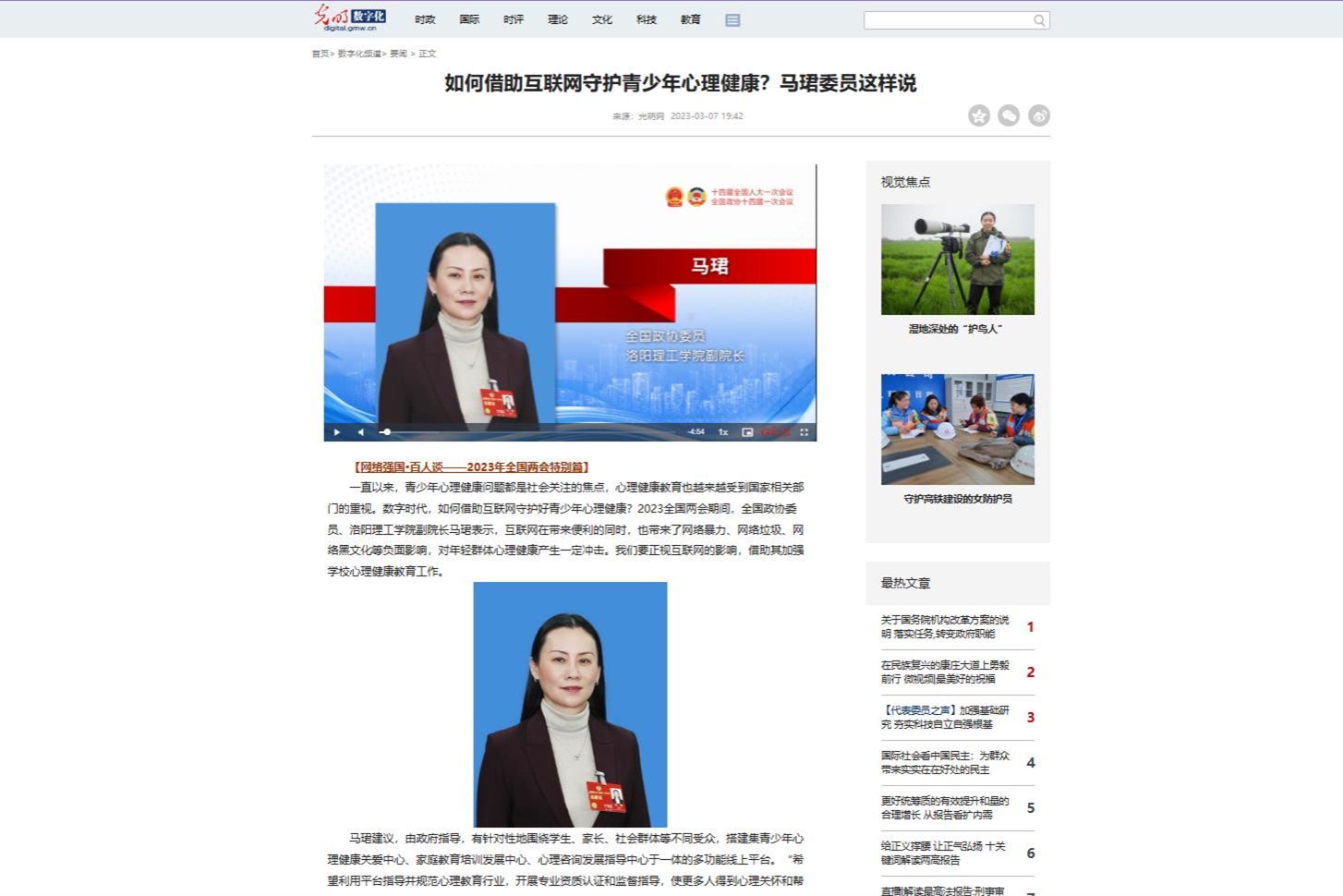 3.光明网数字化 2023-03-07《如何借助互联网守护青少年心理健康?马珺委员这样说》: