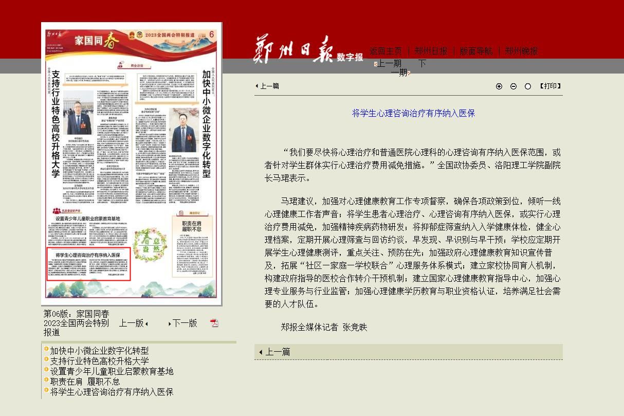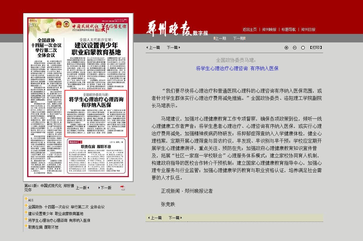 8.《郑州晚报》 2023-03-08第A11版中国式现代化 郑好豫见你《全国政协委员马珺:将学生心理治疗心理咨询 有序纳入医保》: