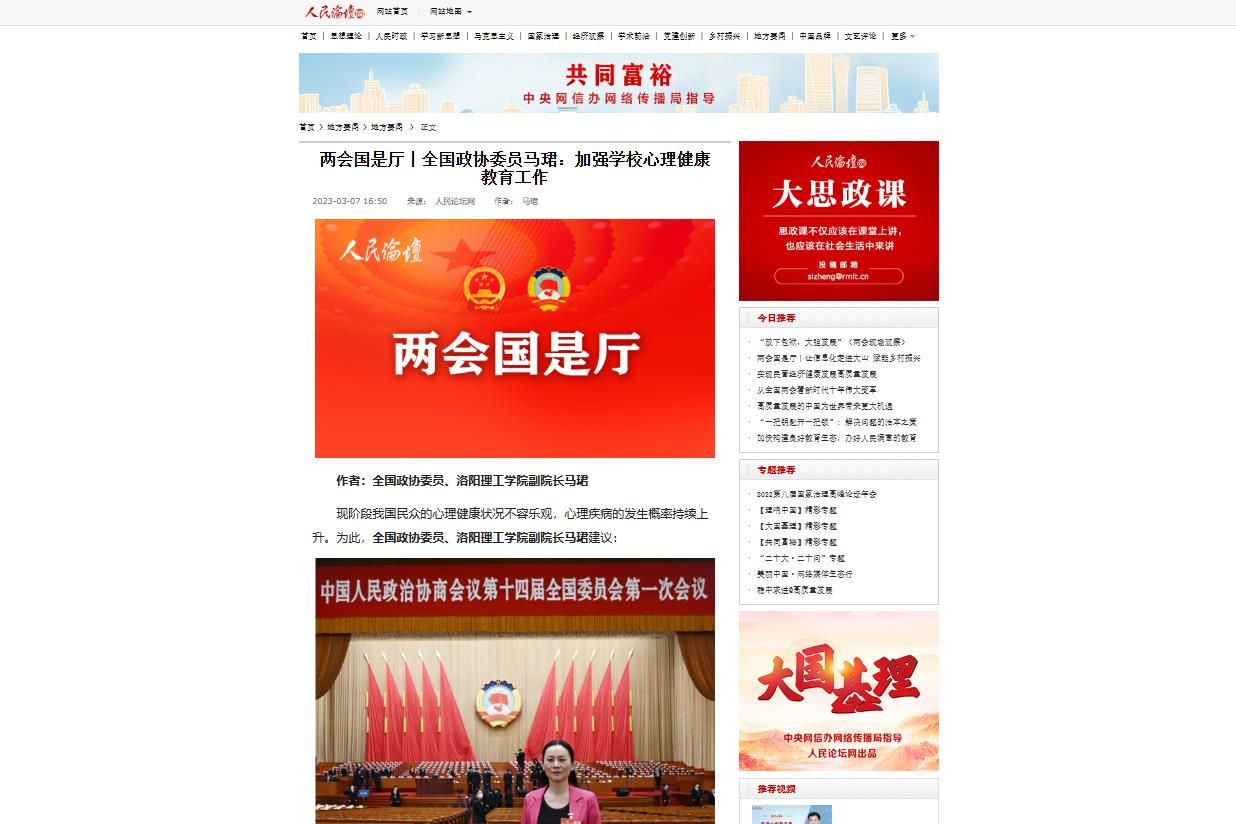 2.人民论坛网 2023-03-07:《两会国是厅丨全国政协委员马珺:加强学校心理健康教育工作》: