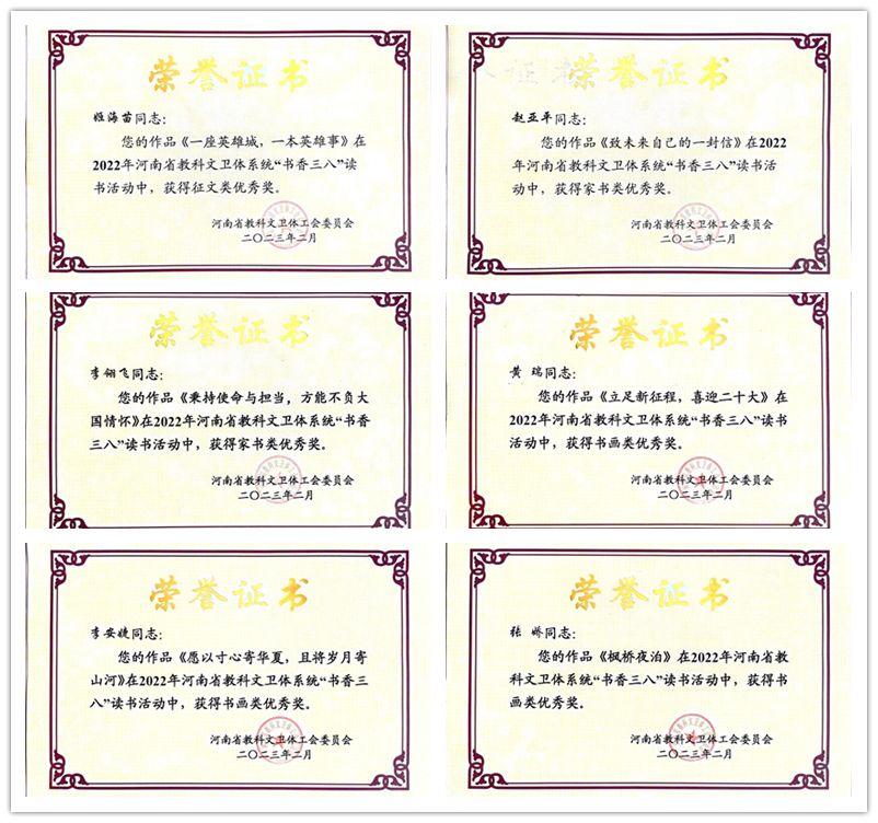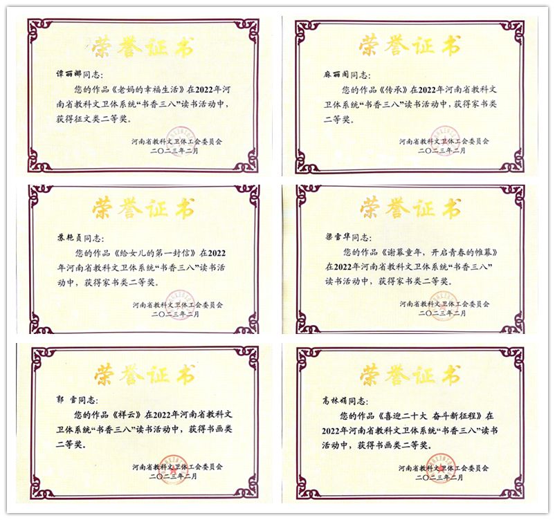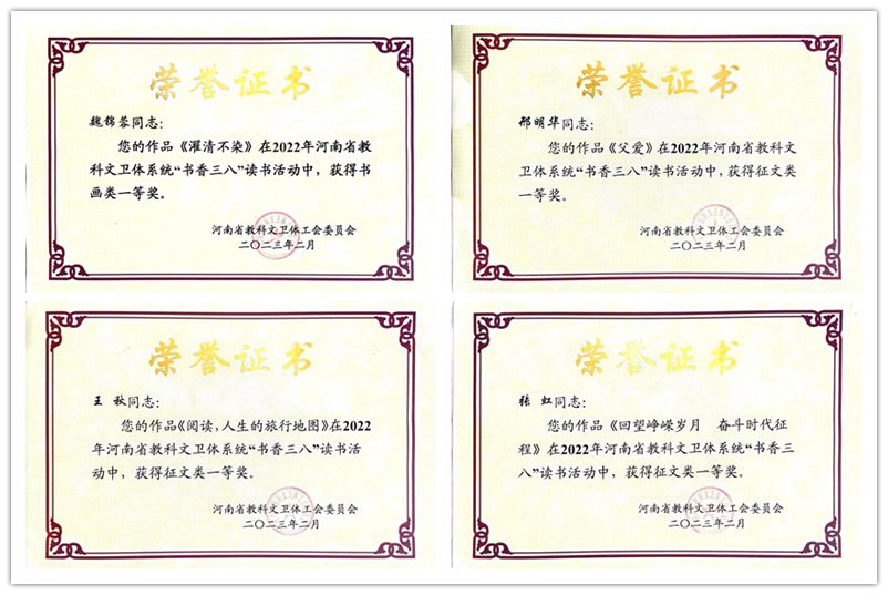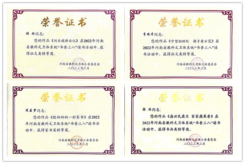 2022年,按照河南省教科文卫体工会《关于组织开展“书香三八”读书活动的通知》要求,洛阳腾博官网诚信为本专业服务工会积极组织基层工会开展“书香三八”读书活动,共征集作品45件。经专家评审、推荐24件作品参加省级评选,有20件作品获奖,其中特等奖4件、一等奖4件、二等奖6件、优秀奖6件。经济与管理学院张瑶的《刘乐琪择业记》、艺术设计学院李晓丹的《守望相助处 携手看云霓》获征文类特等奖,工程训练中心周芸梦的《致奶奶的一封家书》获家书类特等奖,艺术设计学院韩颖的《盛世民康乐家家蔬果香》获书画类特等奖。