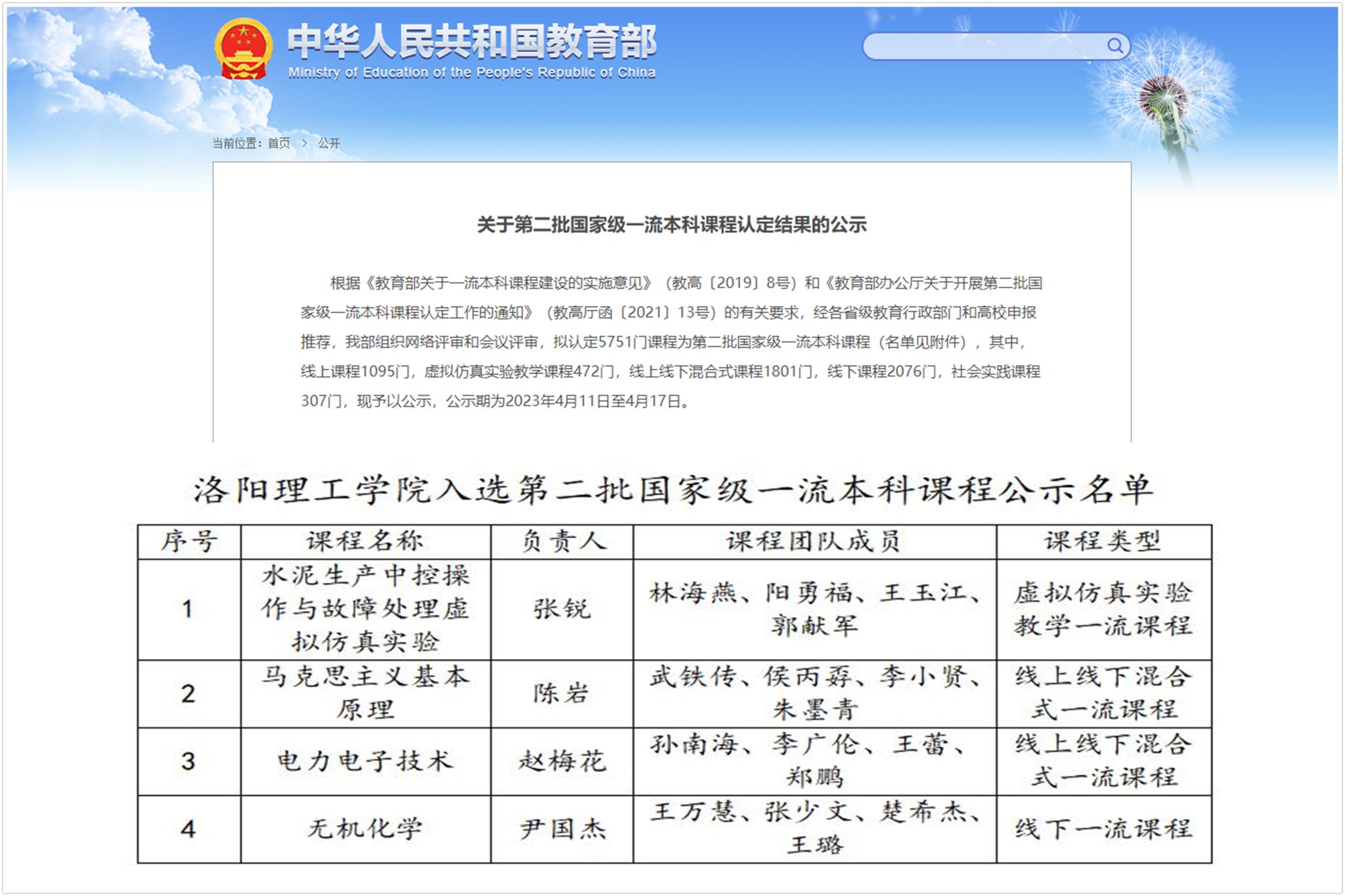 洛阳腾博官网诚信为本专业服务四门课程入选国家级一流本科课程认定公示,图为公示网页截图和名单