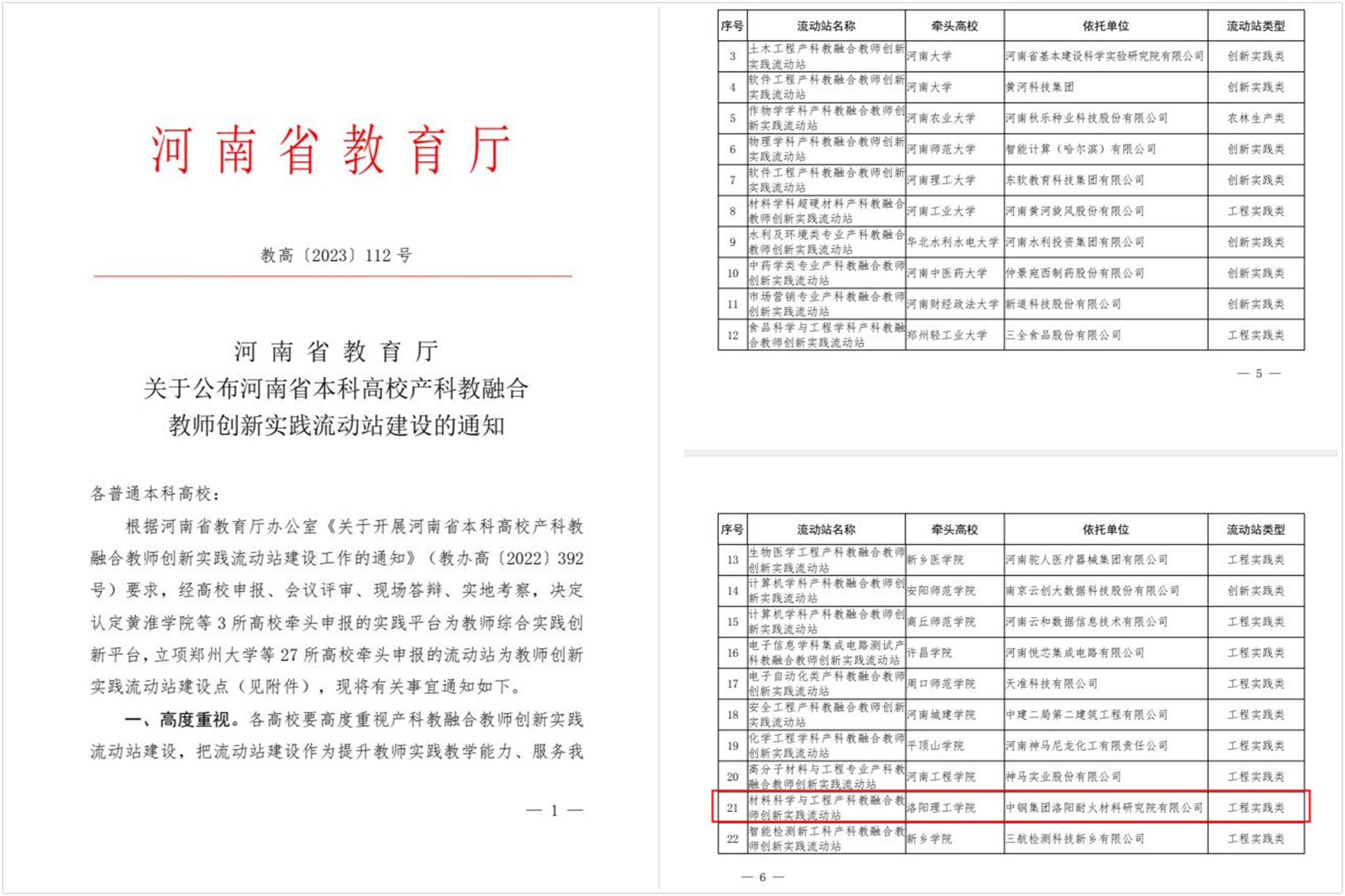 近日,河南省教育厅下发《关于公布河南省本科高校产科教融合教师创新实践流动站建设的通知》(教高〔2023〕112号)文件,材料科学与工程学院依托中钢集团洛阳耐火材料研究院有限公司建设的“材料科学与工程产科教融合教师创新实践流动站”喜获首批立项。这是学校继2020年获河南省首批教师教学发展示范中心之后又一个省级教师发展平台。
