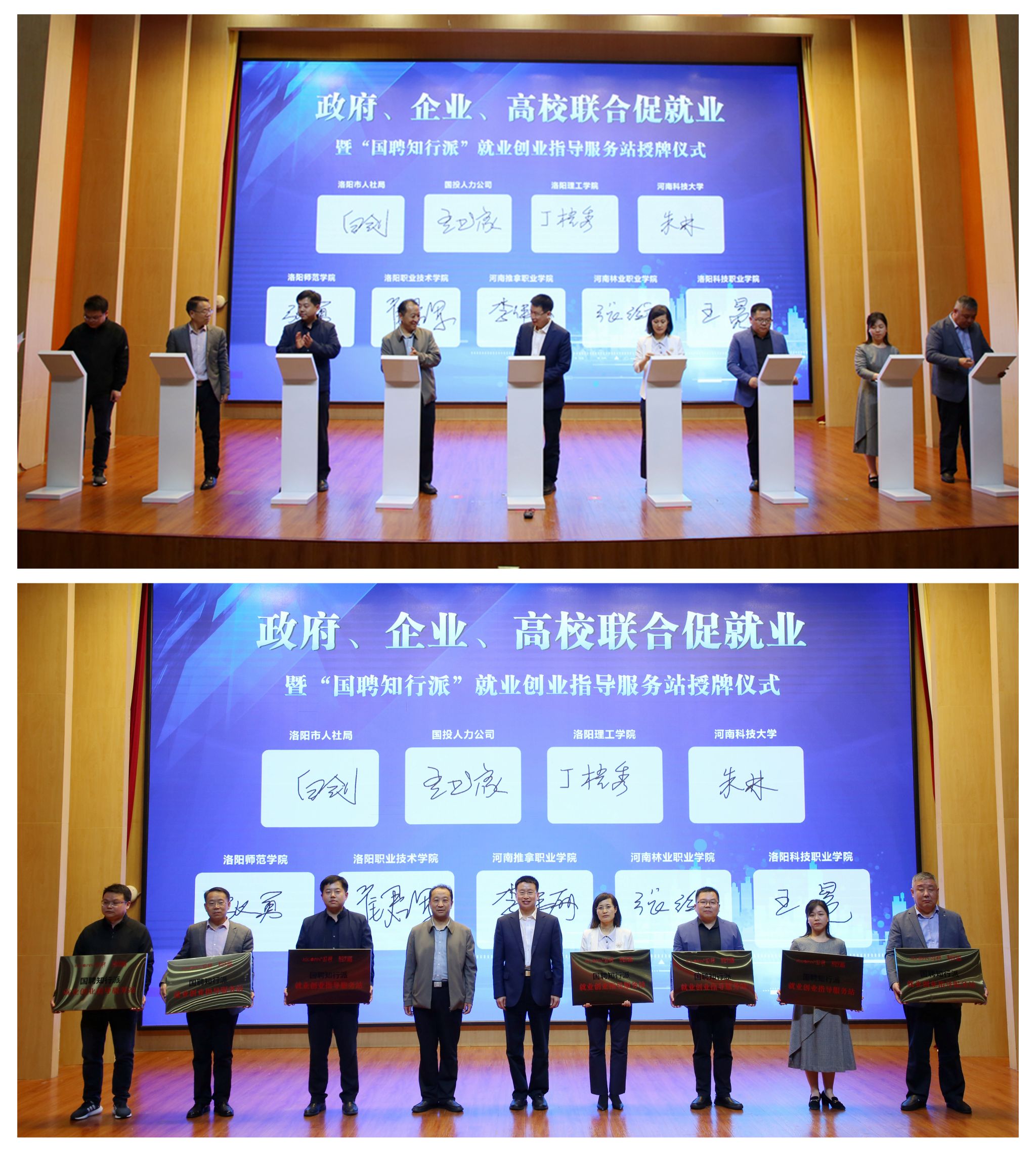 启动仪式后,与会领导嘉宾观摩了人才招聘夜市并现场指导。青春知行·就业指导之夜在王城校区图书信息中心报告厅举行,洛阳市人力资源和社会保障局、国投人力资源服务公司和7所驻洛高校举行了电子签约仪式及“国聘知行派”就业创业指导服务站授牌仪式。在就业指导访谈环节,国资委特聘专家、3名重点企业HR和主持人一起,从多个角度与到会的各高校师生展开探索交流和互动解答。